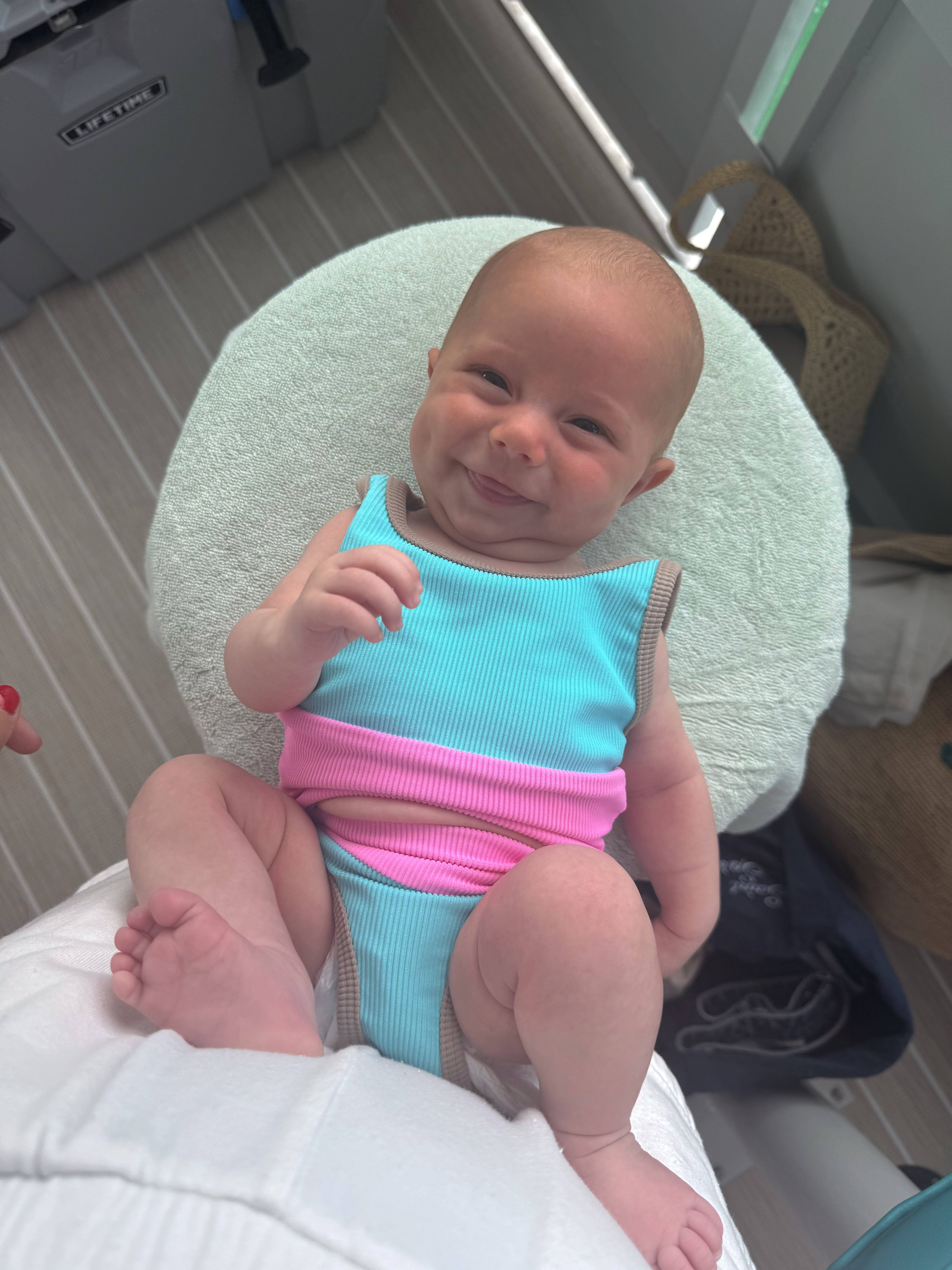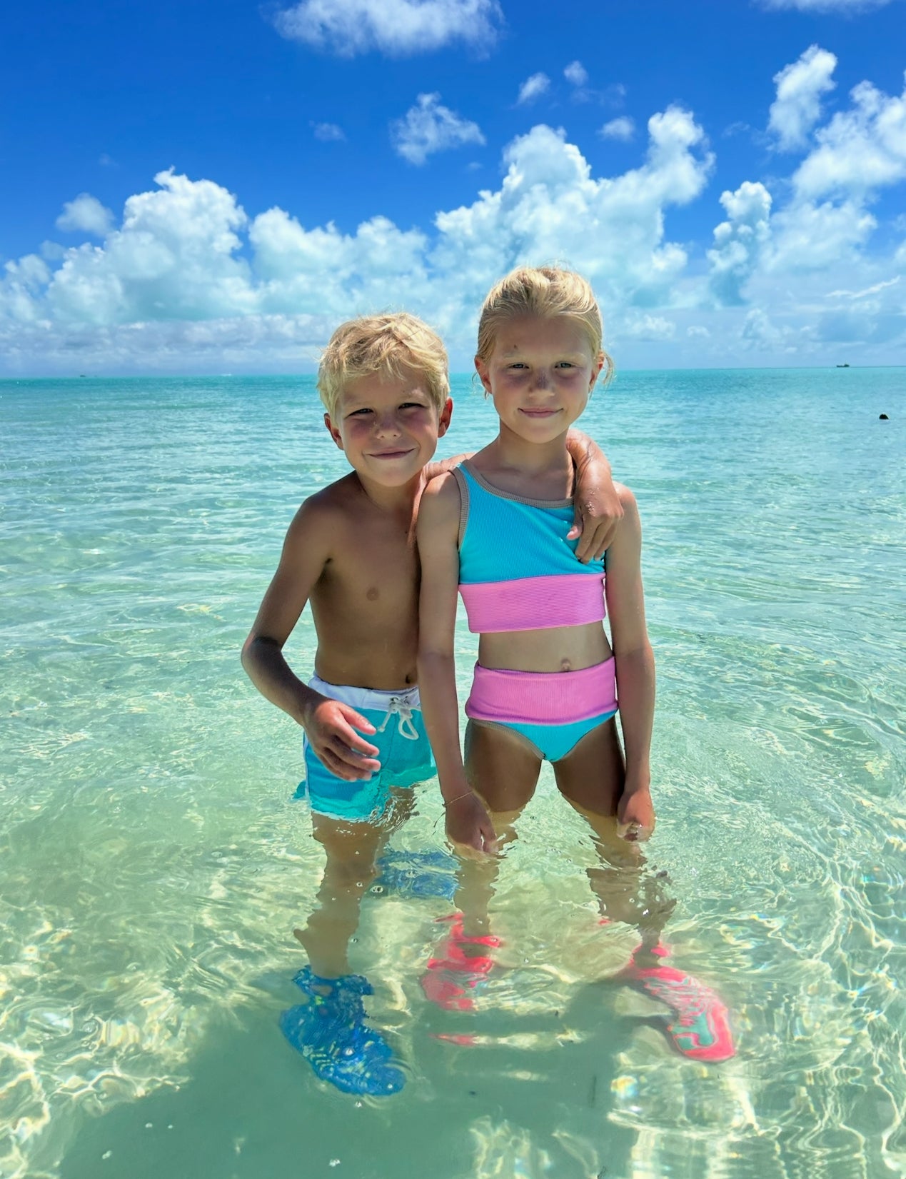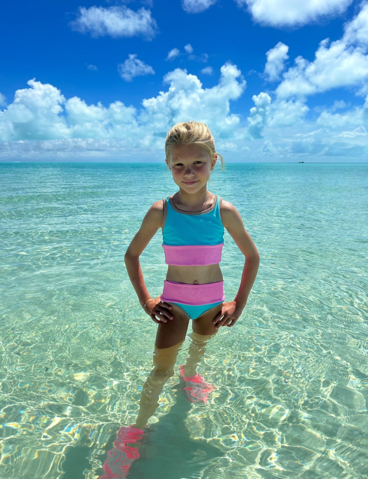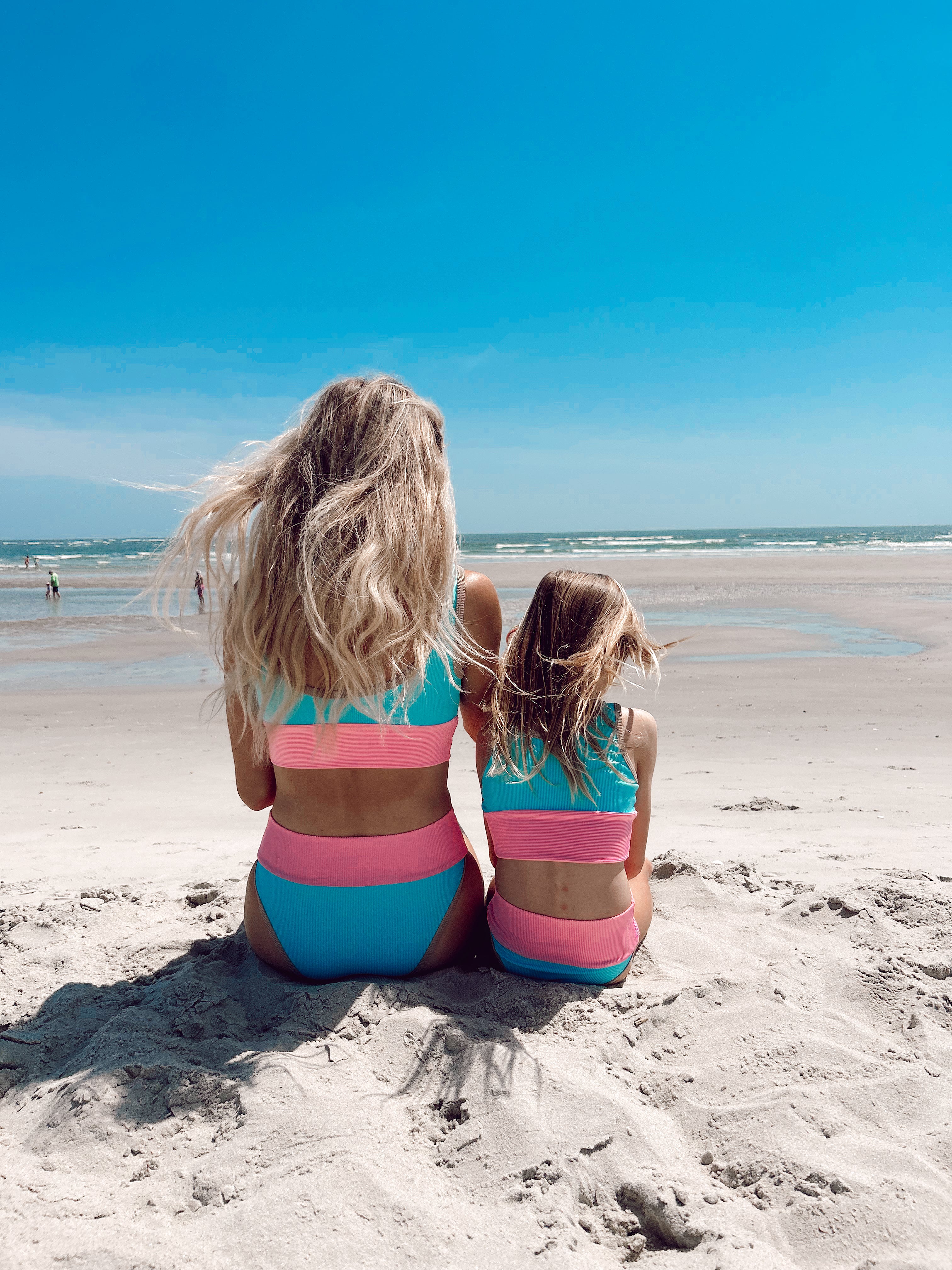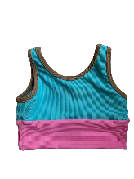 Our newest girls style in mini bikini version. Colorblock: Sea, Pitaya with Sand trim. Matches Mom! Size down for perfect fit! Model in size 4/5.MADE IN THE USA- OEKO-TEX CERTIFIED Material.