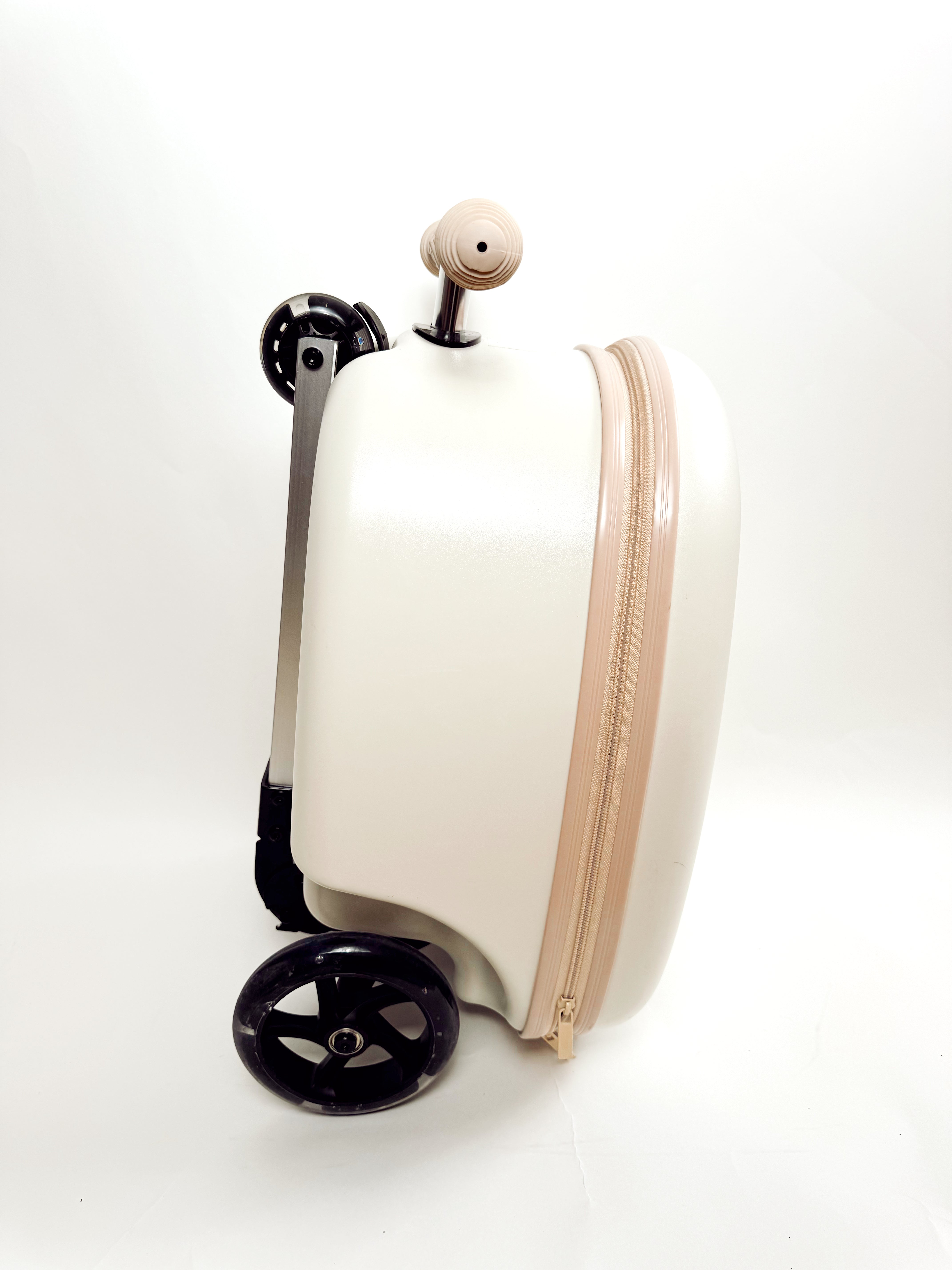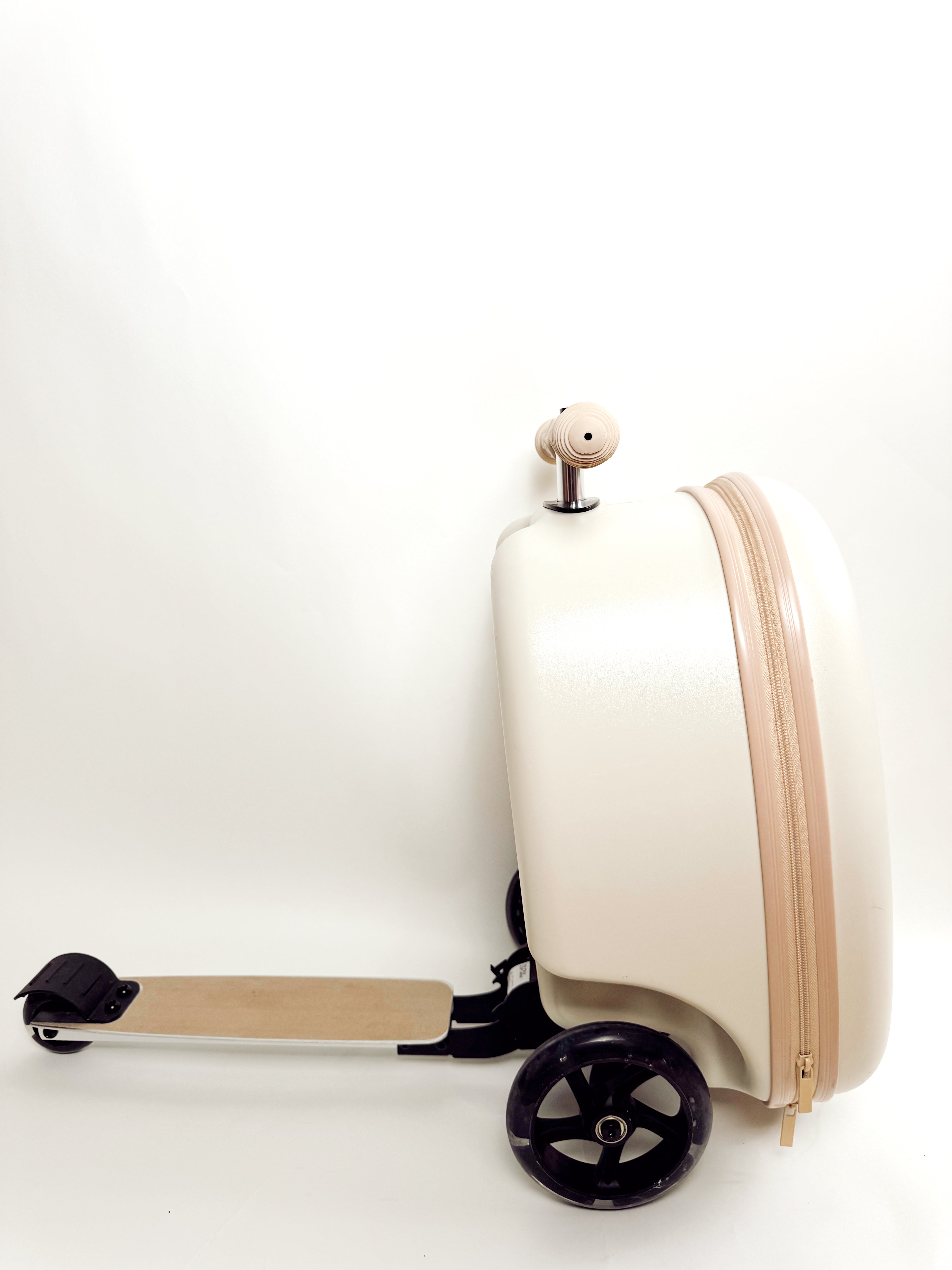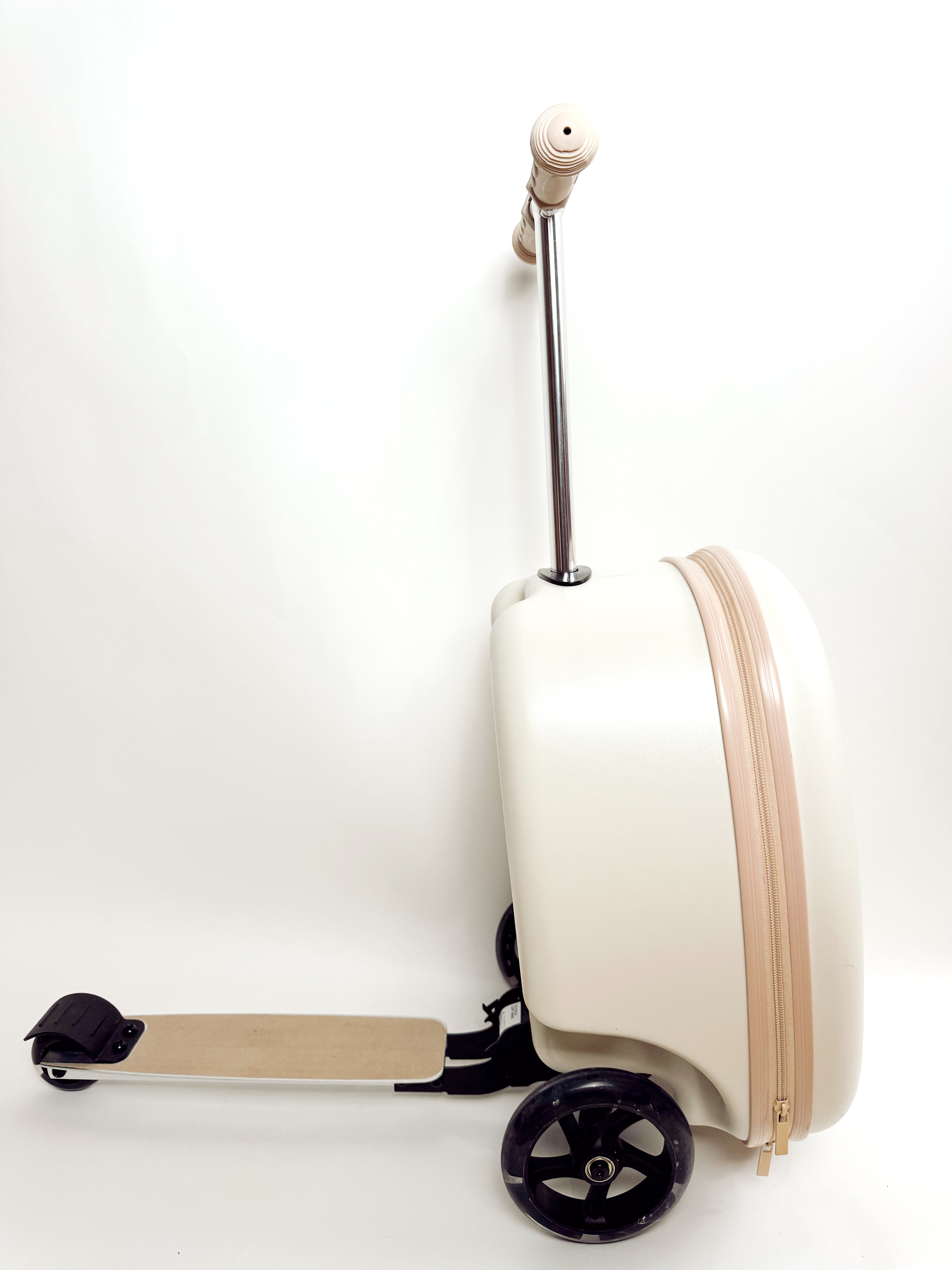 Imediate shipment! our new 2 in 1 luggage scooter. Sleek design, Hard shell, with built in/foldable scooter. LED wheels. Shade: Cream, with Tan trim, Easy grip rubber handle bars. Scooter Lock in place for safety and foot brake.