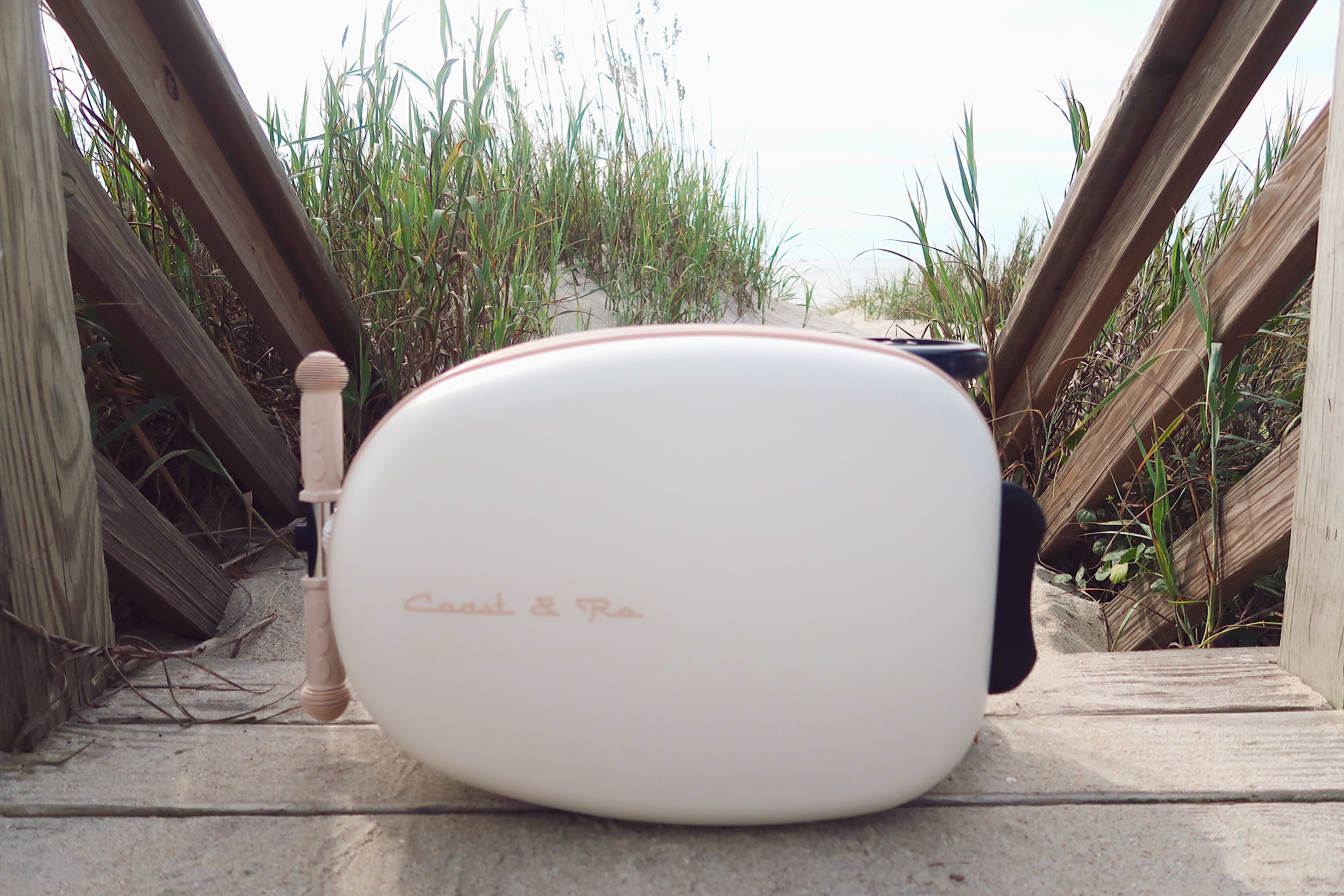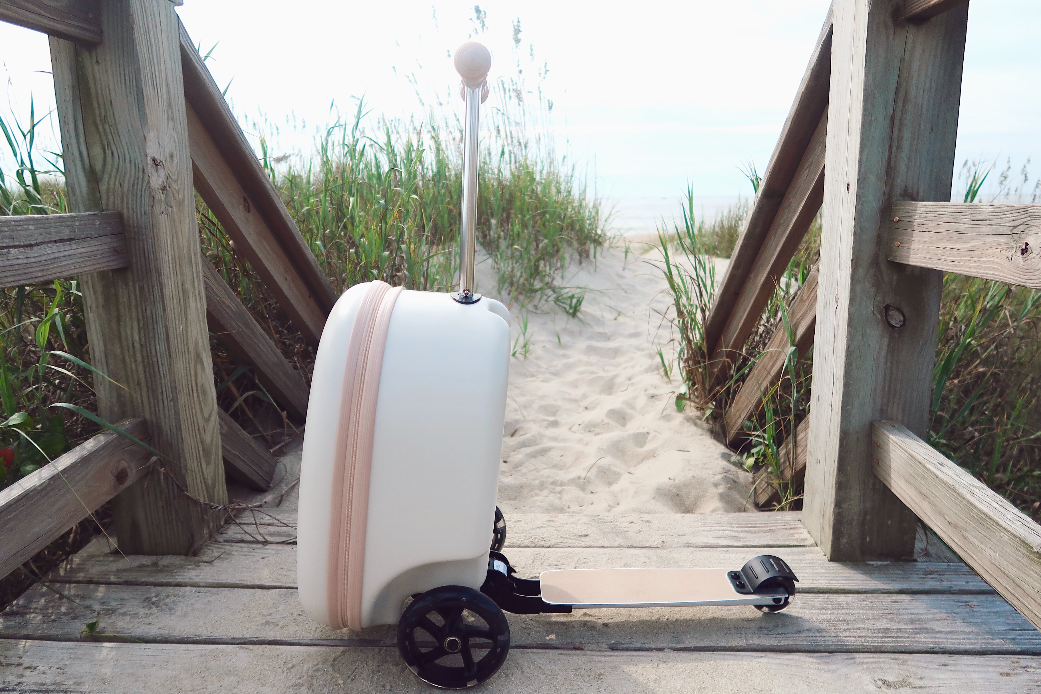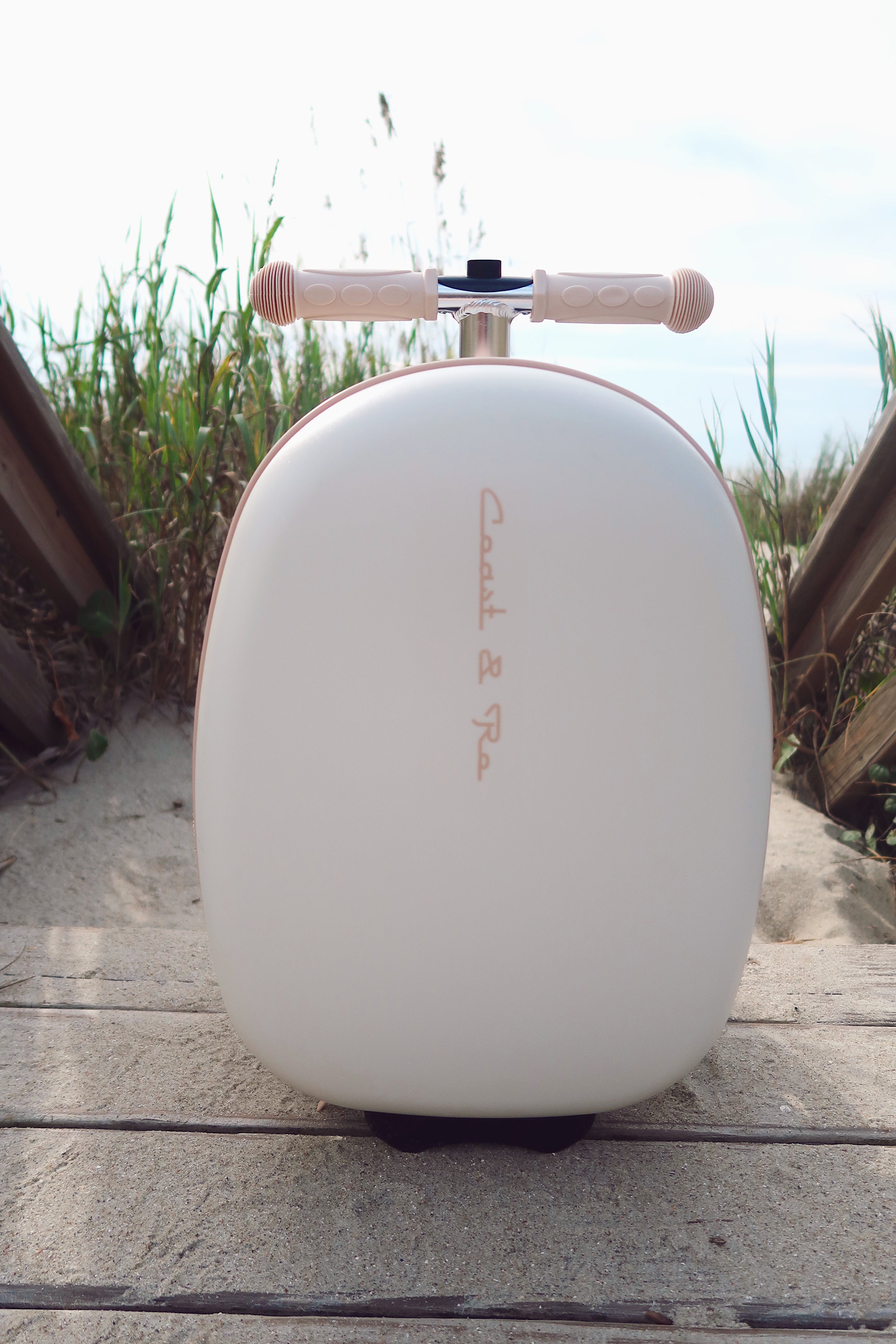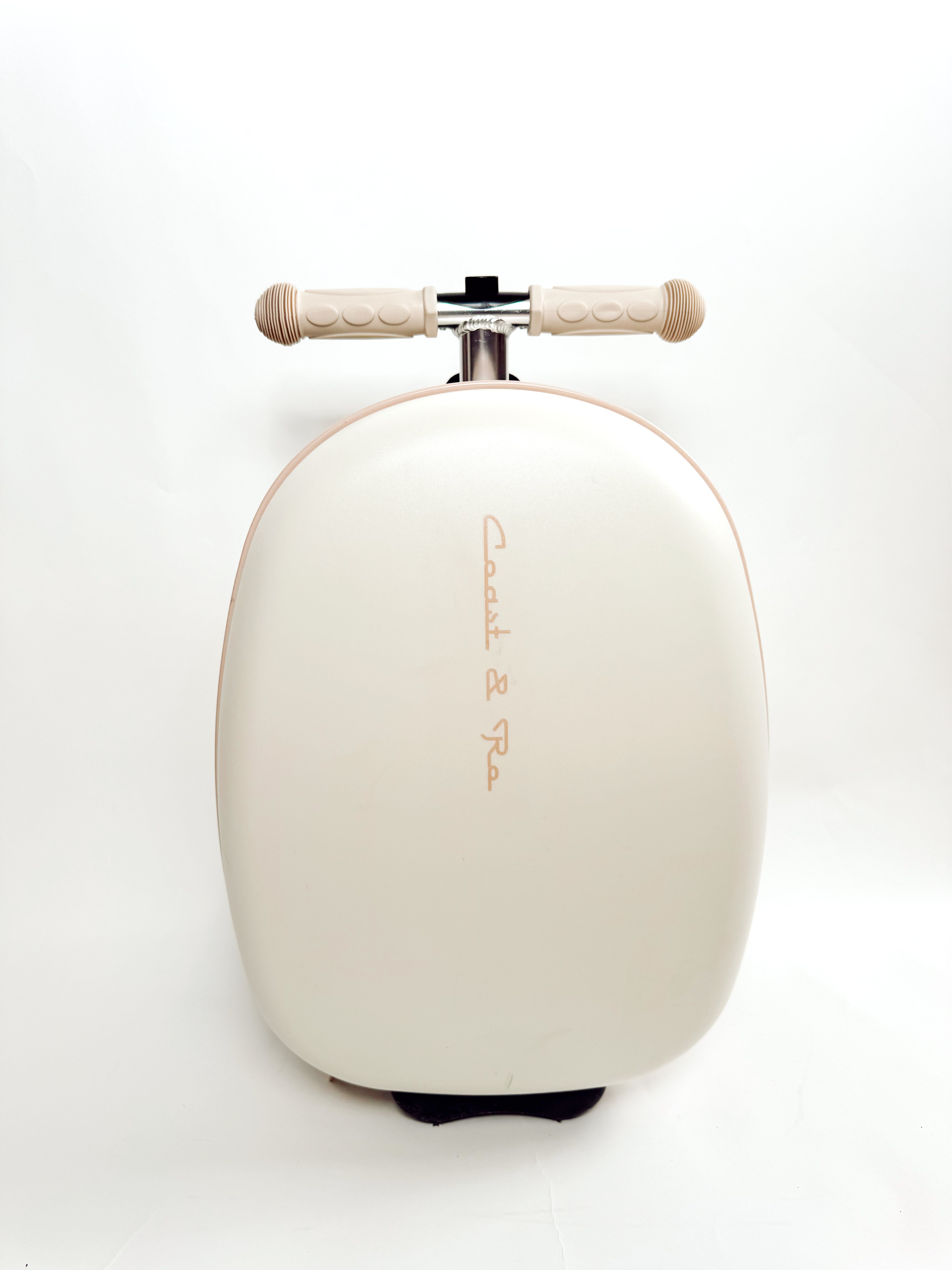 Imediate shipment! our new 2 in 1 luggage scooter. Sleek design, Hard shell, with built in/foldable scooter. LED wheels. Shade: Cream, with Tan trim, Easy grip rubber handle bars. Scooter Lock in place for safety and foot brake.