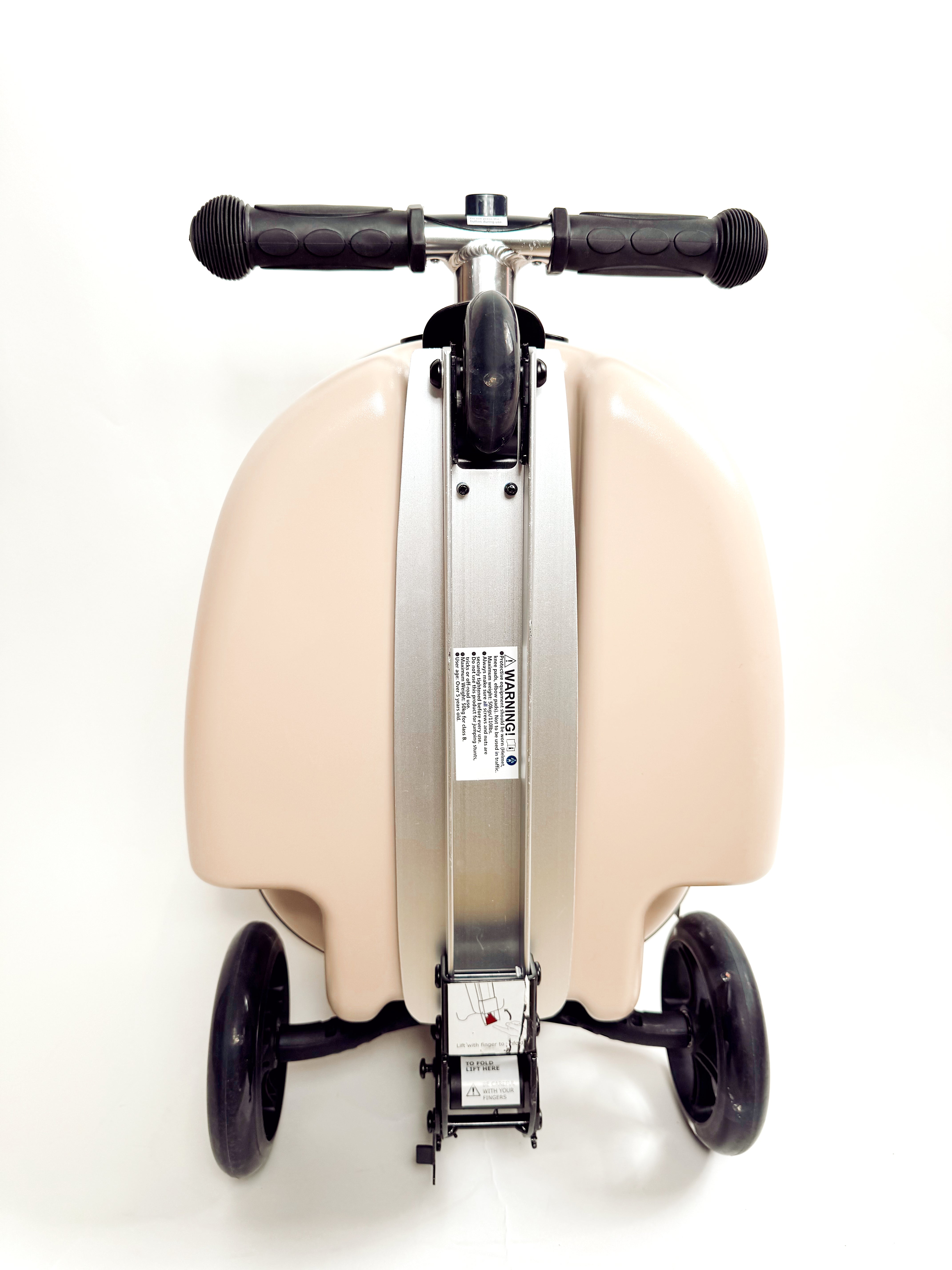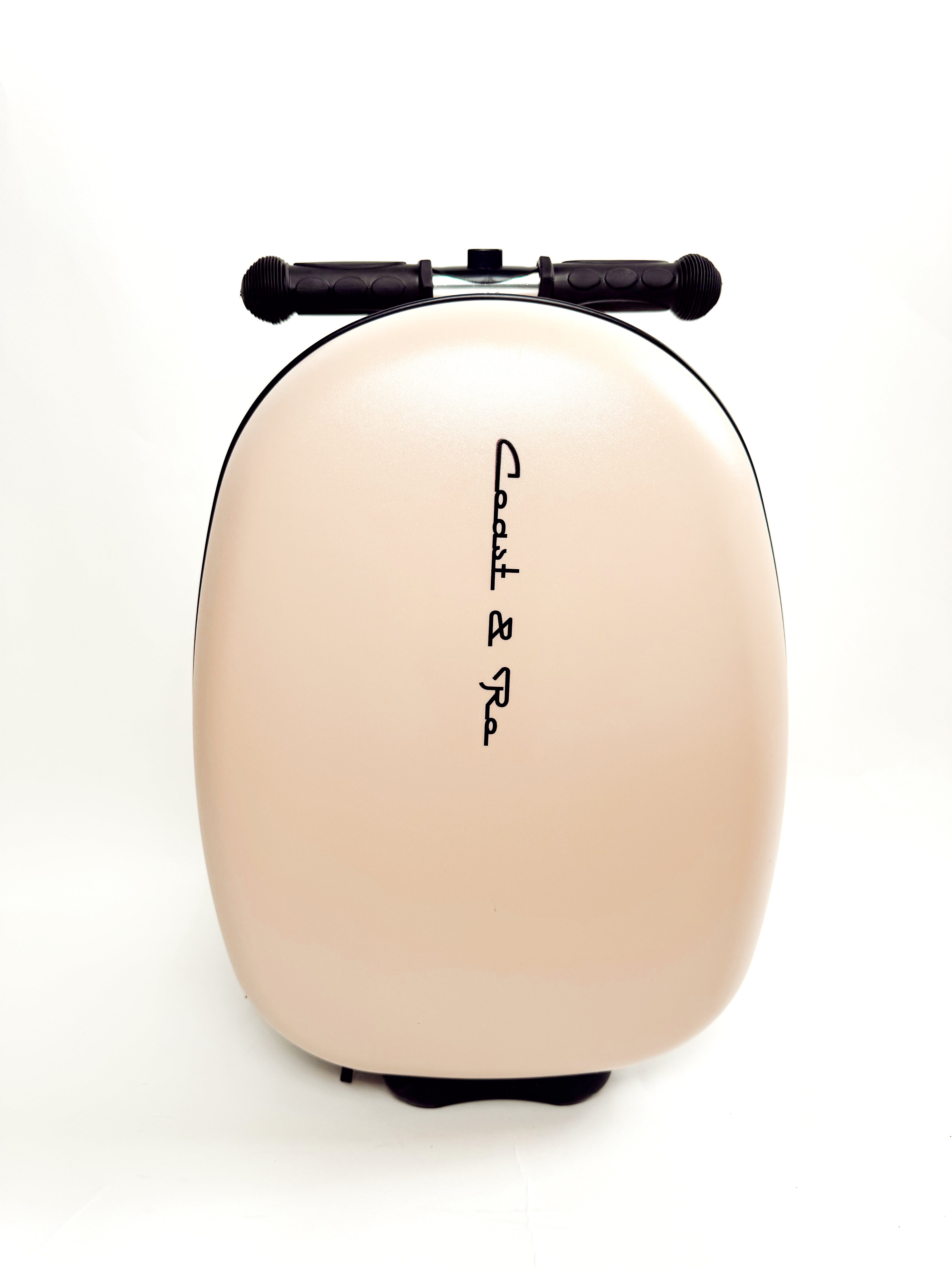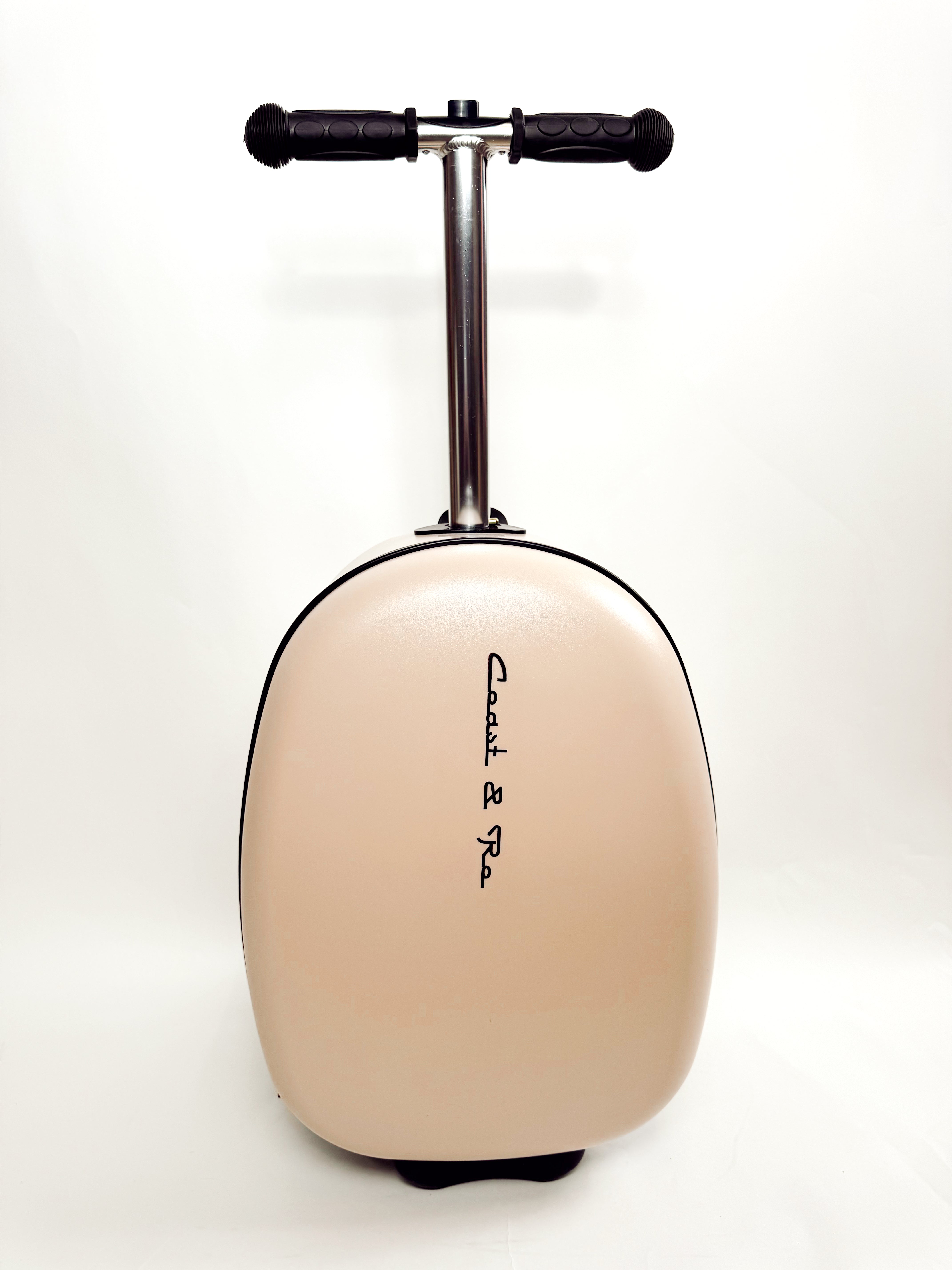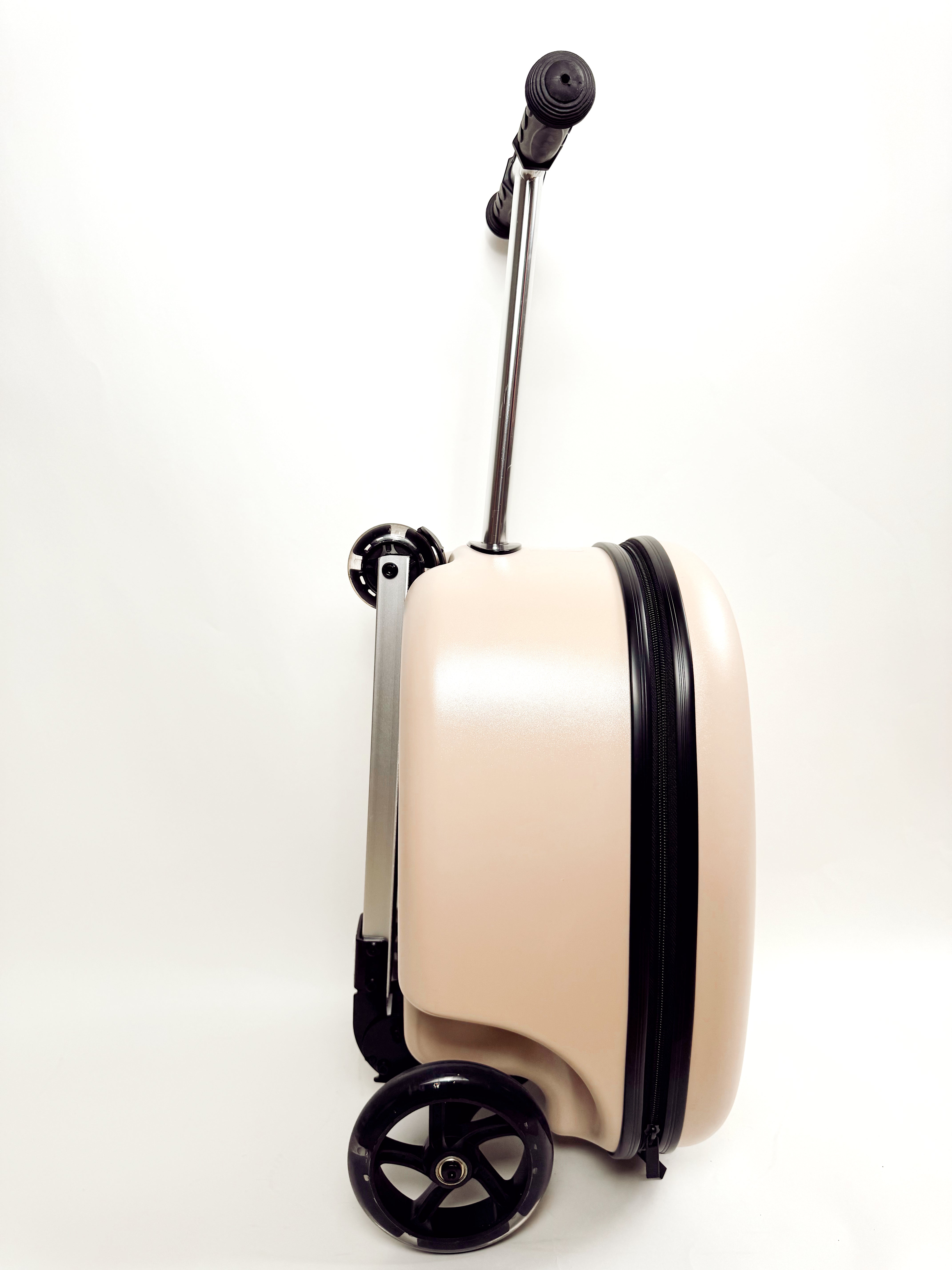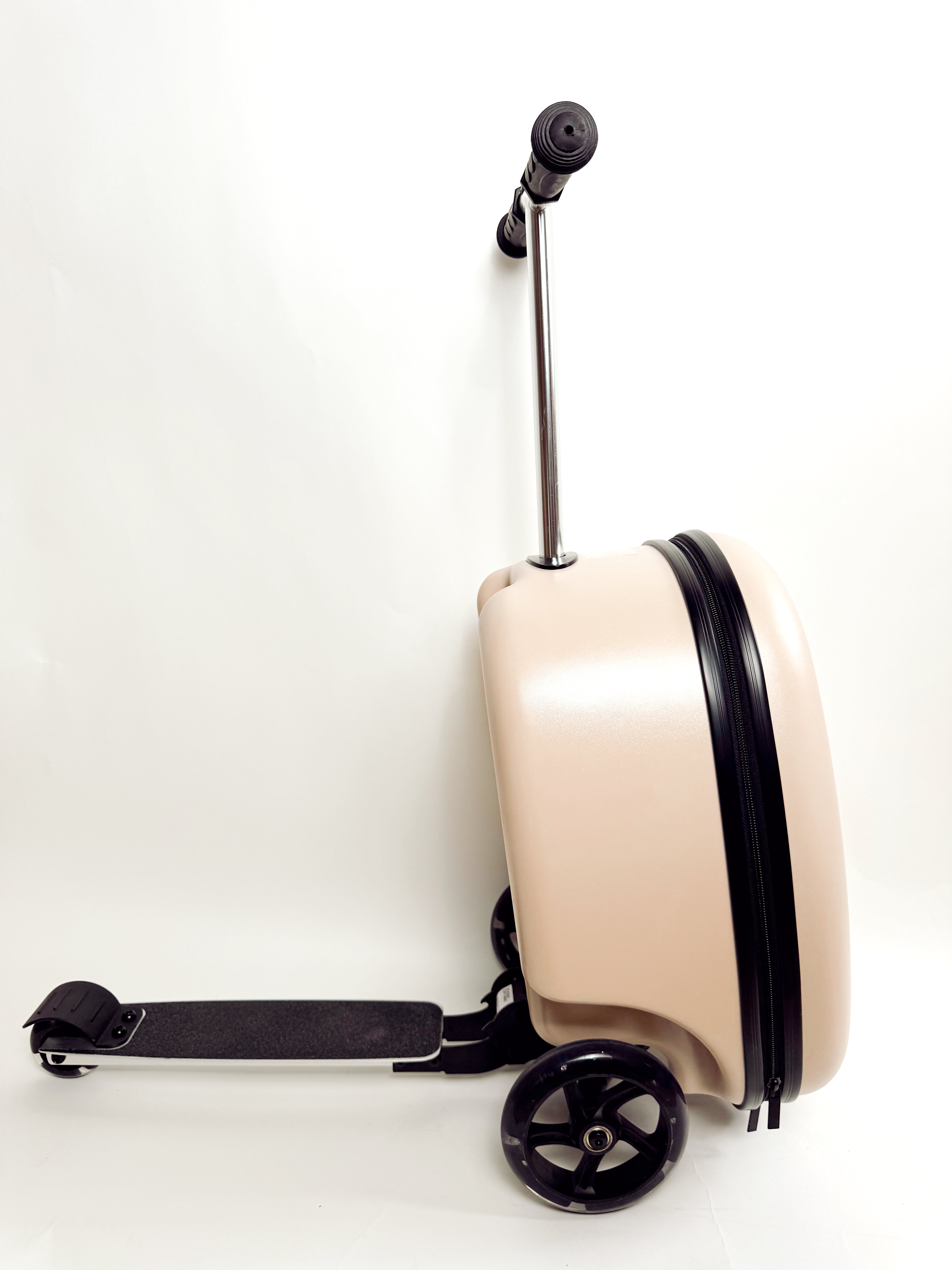 Imediate shipment! our new 2 in 1 luggage scooter. Sleek design, Hard shell, with built in/foldable scooter. LED wheels. Shade: Tan, with Black trim, handle bars. Easily fits in overhead bin. Scooter Lock in place for safety.