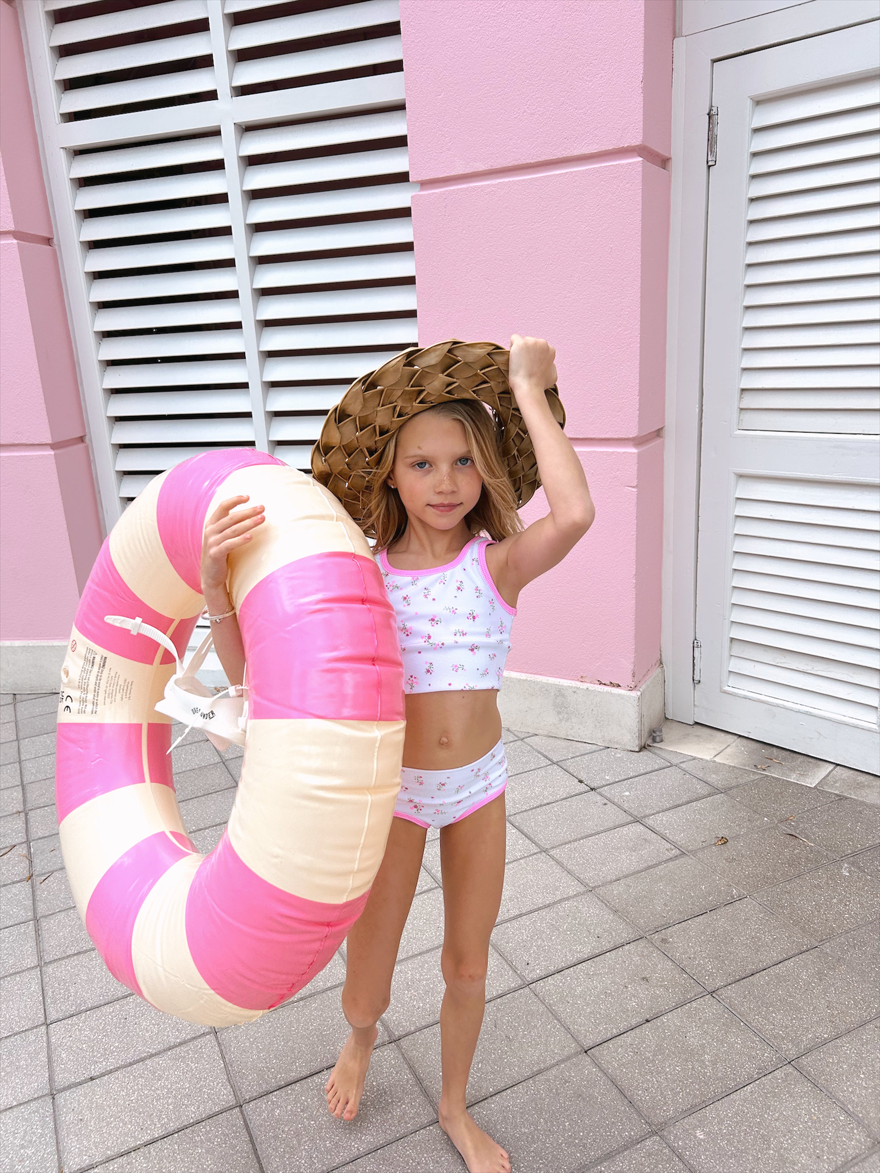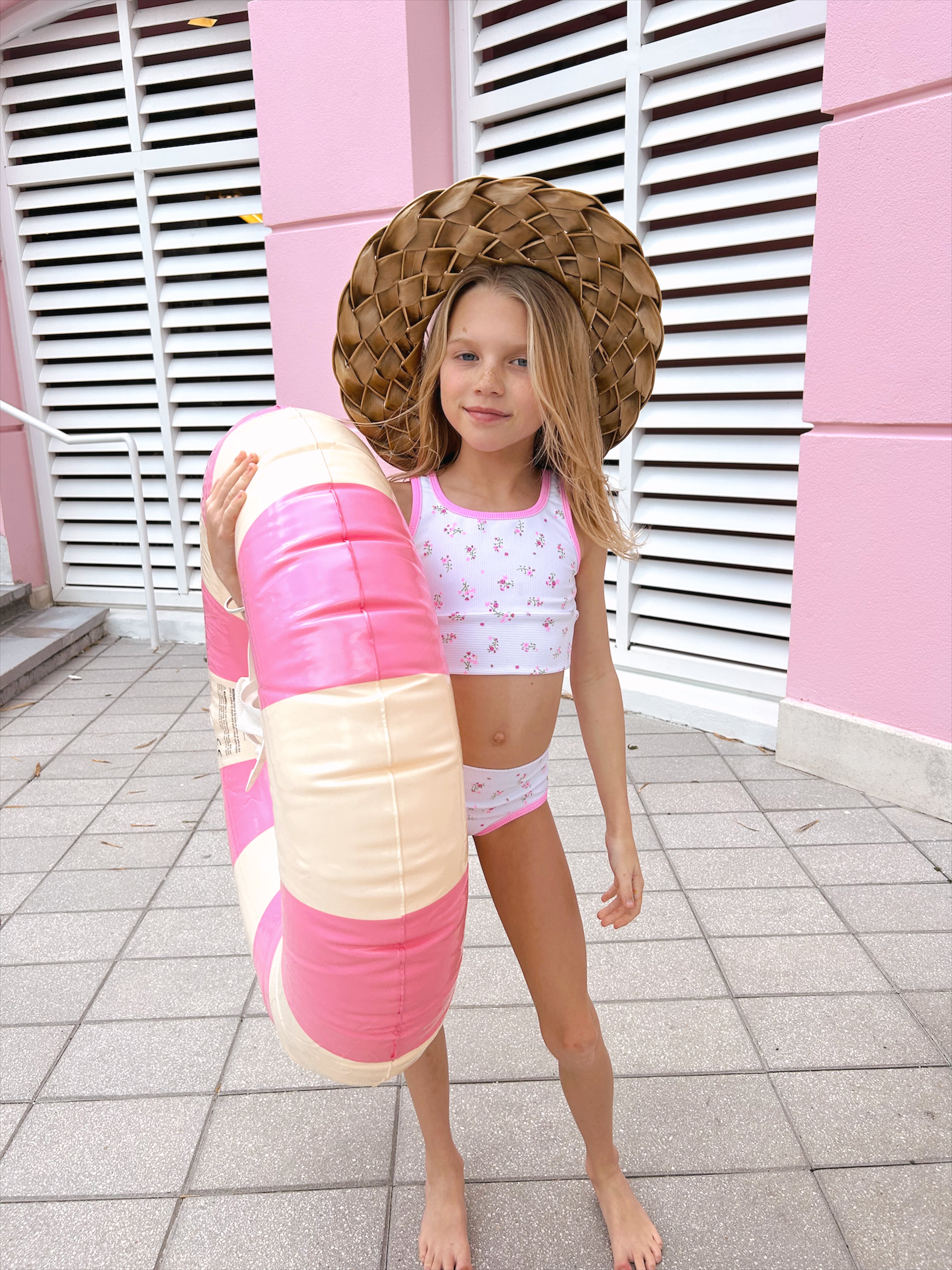 Mini girls bikini to match mama! In ditsy floral print, mix and match with pitaya/dragon fruit shades. Ribbing is pitaya trim! Size down for better fit.