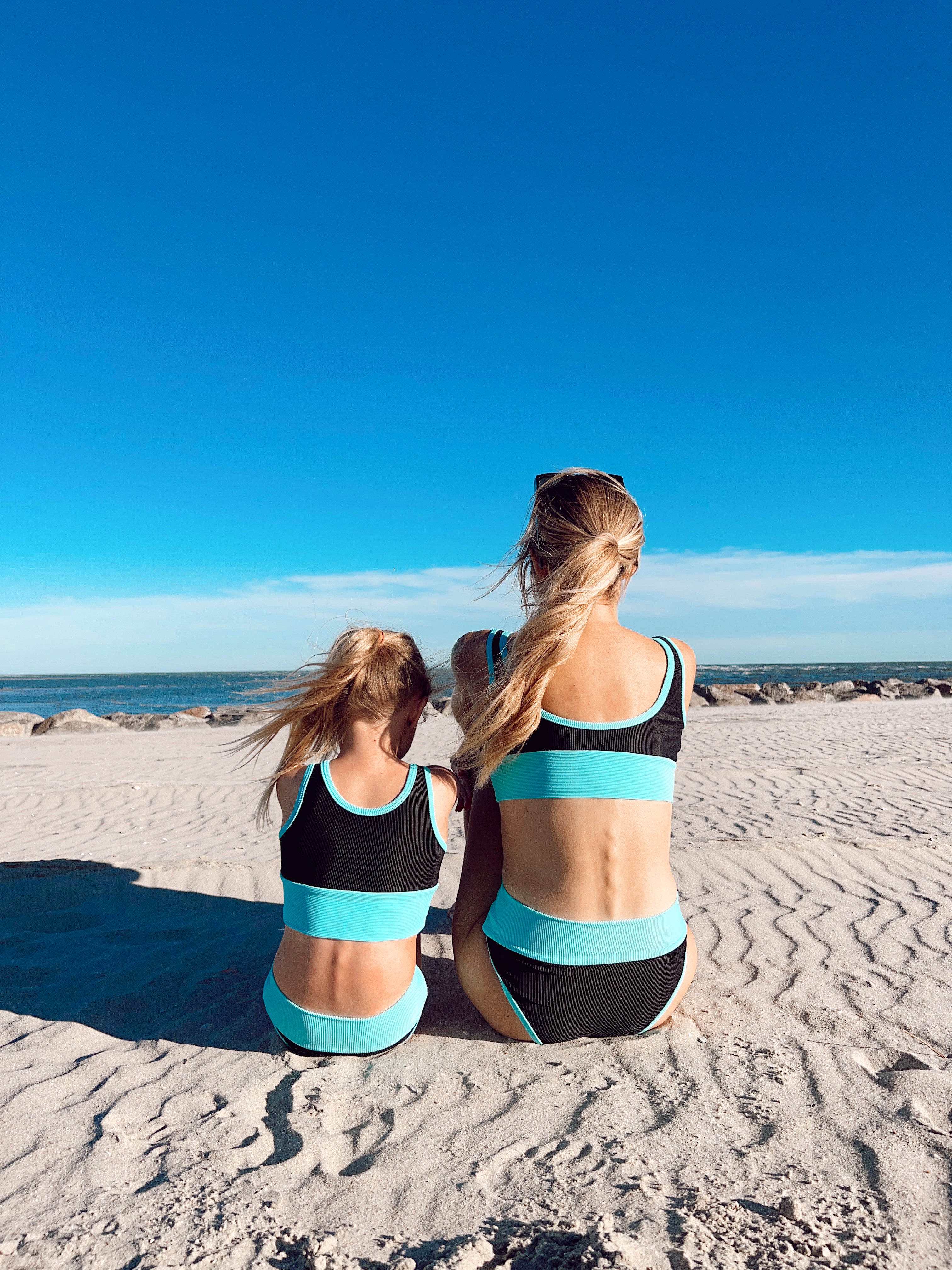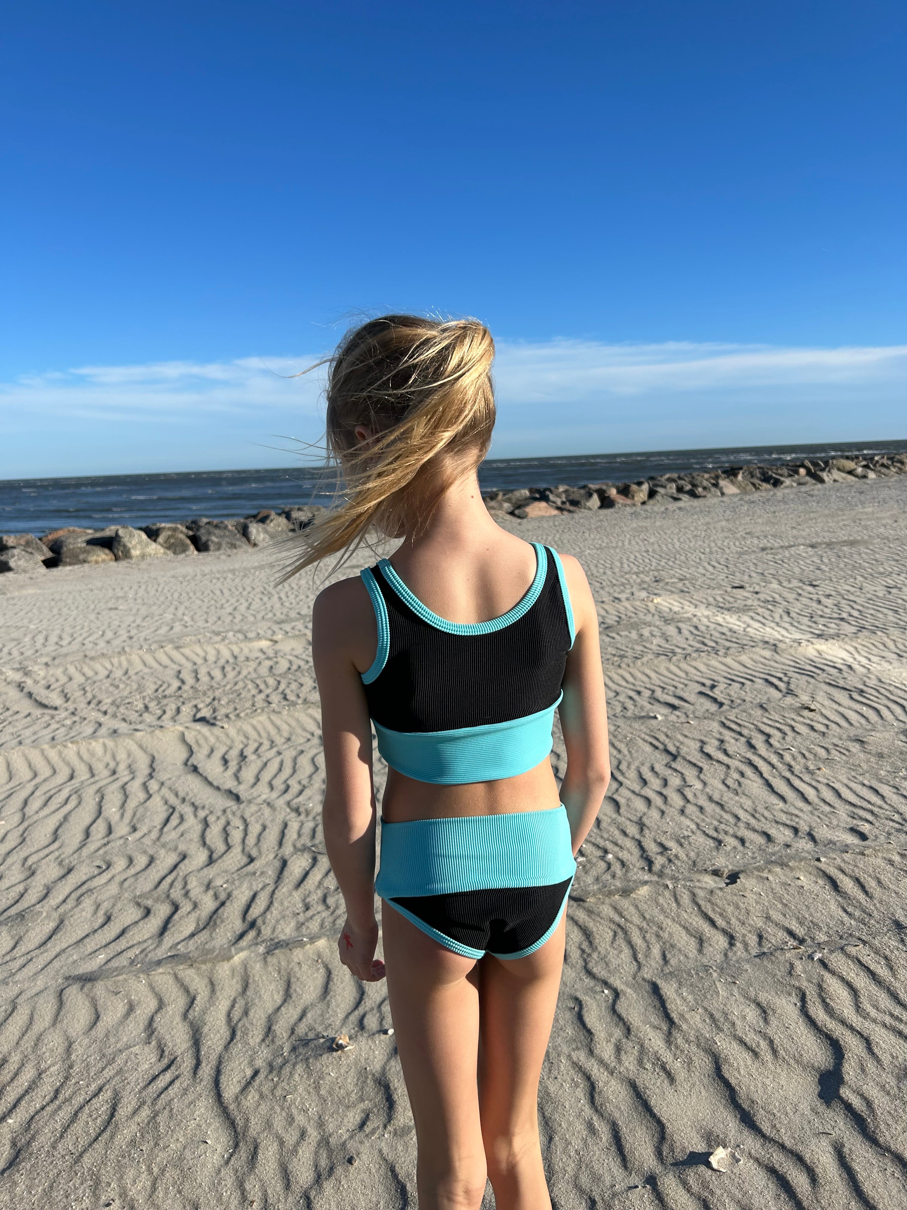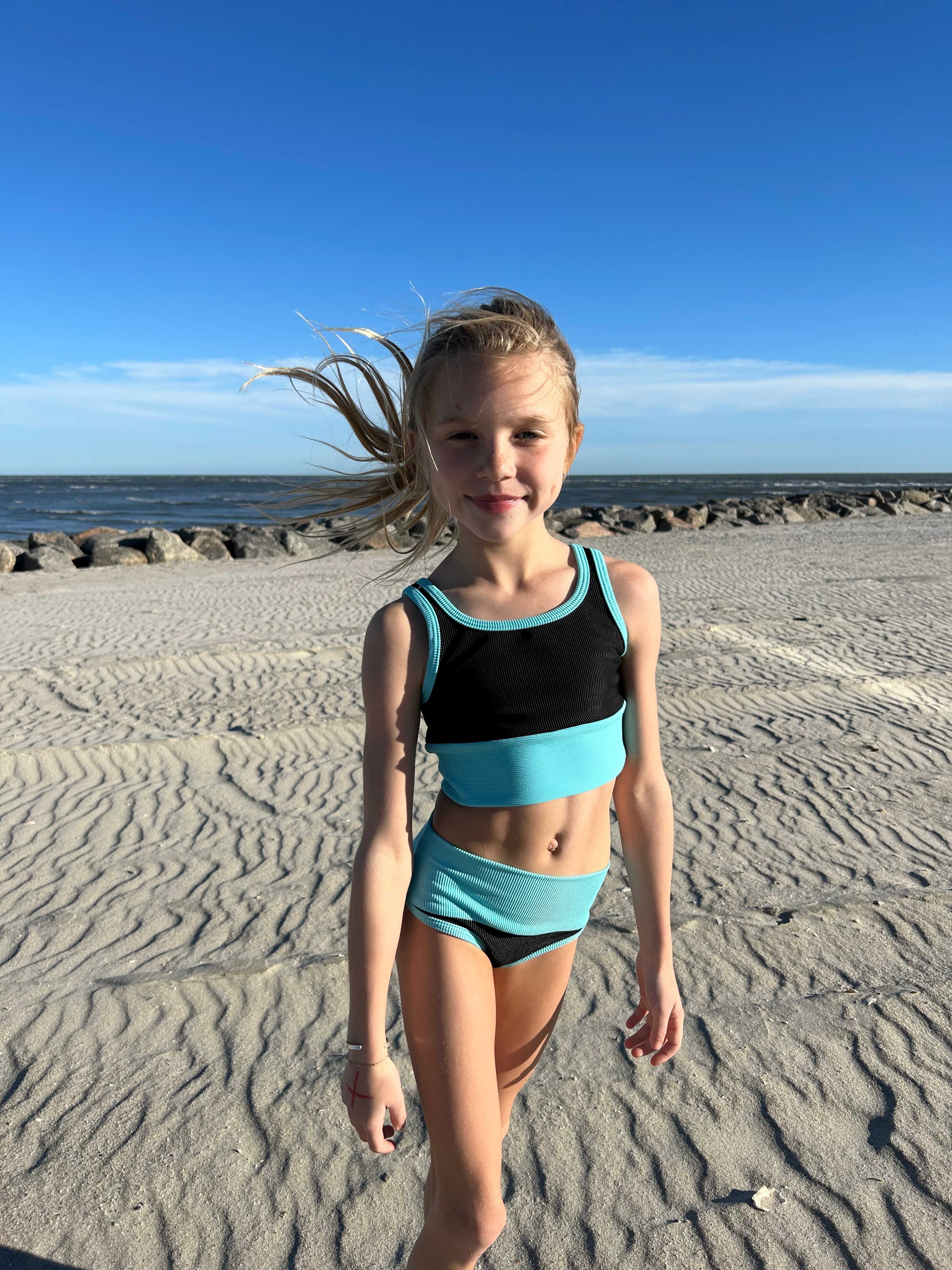 Mini ribbed bikini set to match mama.  Size down best fit, model wearing size 4/5.  Black and Sea shade trim/band.
