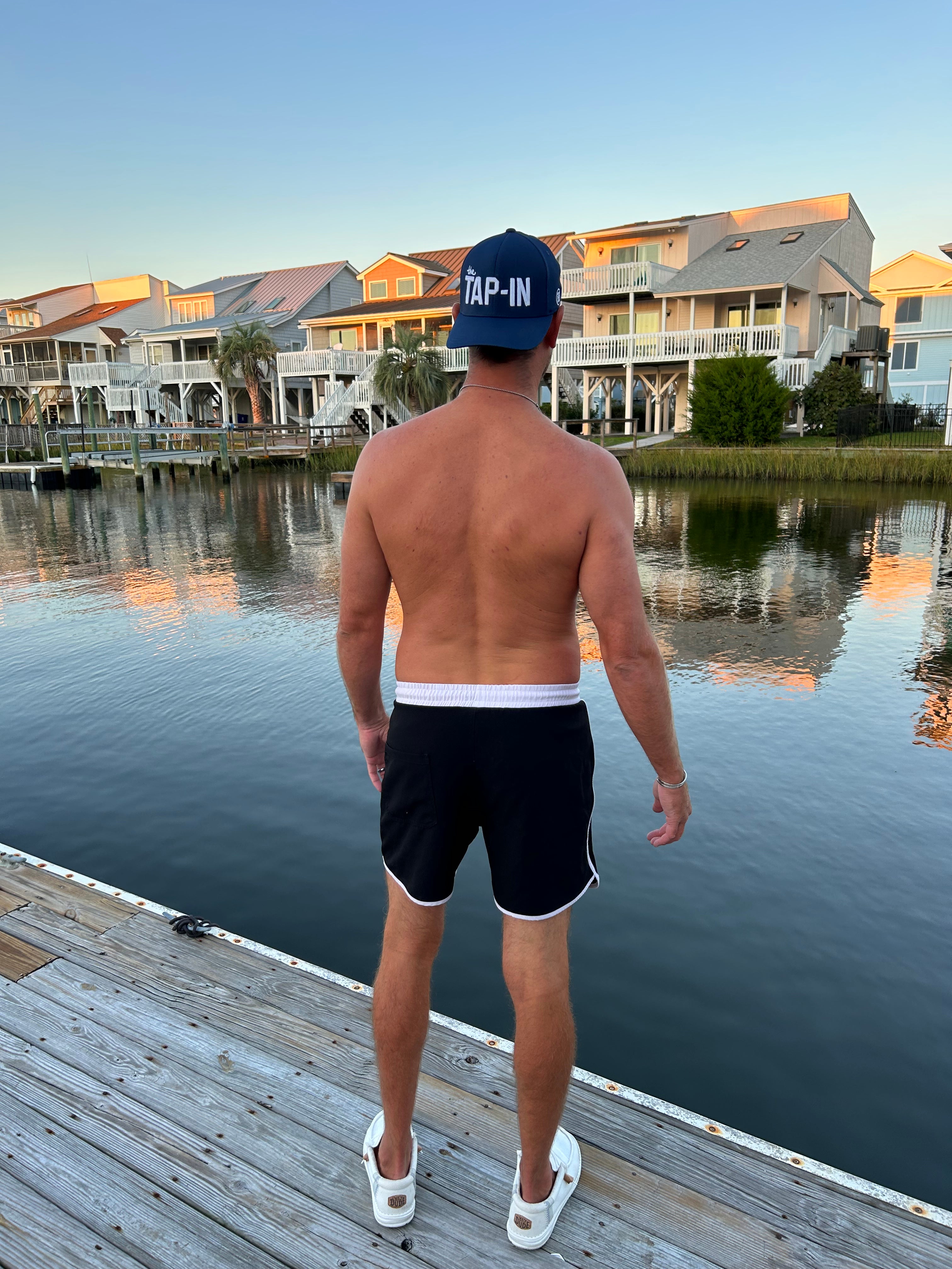 Mens black swim trunks to match the entire family. New updated style is more fitted, 14 1/2 outseam. No Liner, elastic waist band. Runs TTS. Model wearing size Medium, Waist in 34.