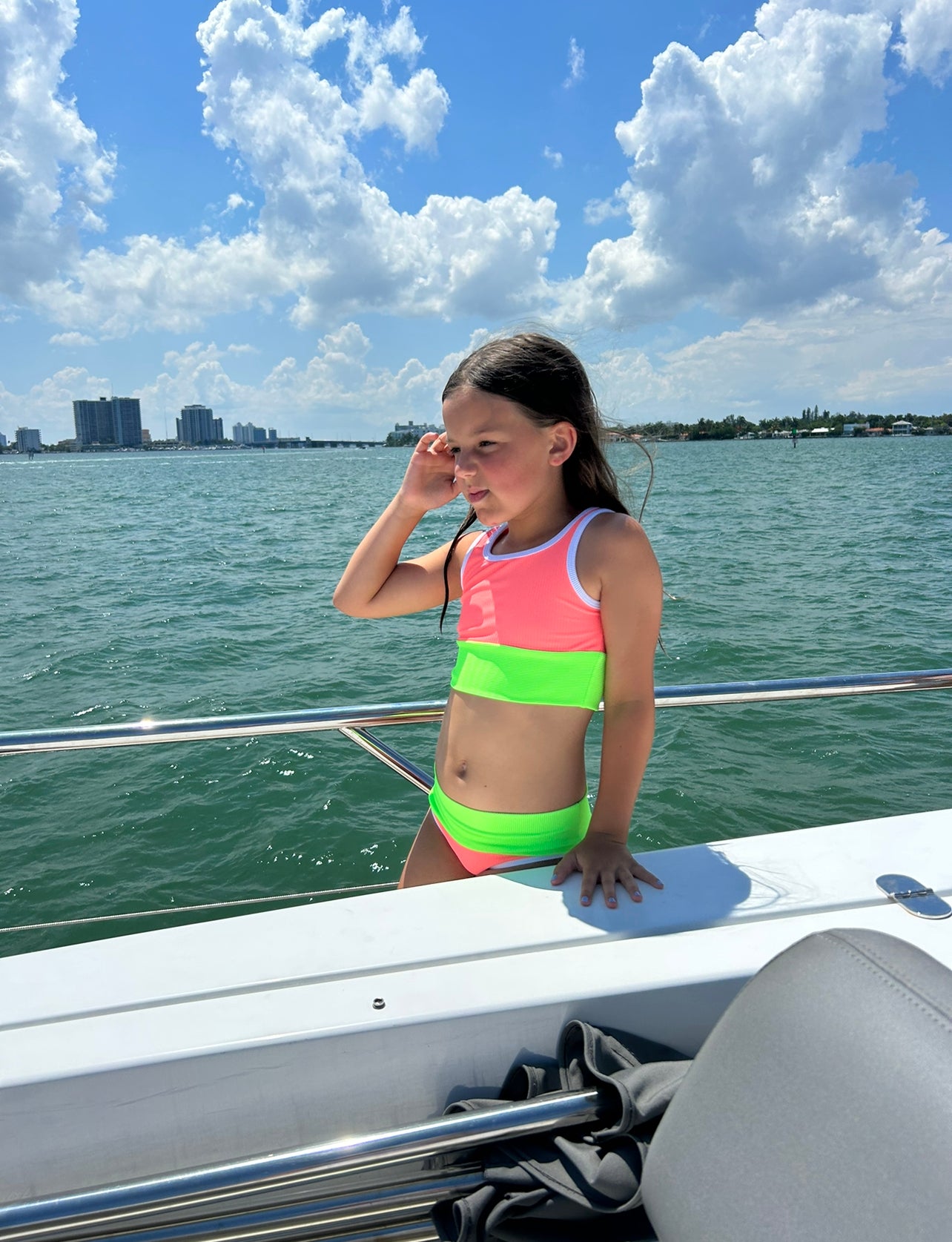 Runs TTS, size down for better fit. Matches mom electric watermelon! Matches with Neon Coral and Neon lime. Model wearing size 8/9.