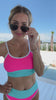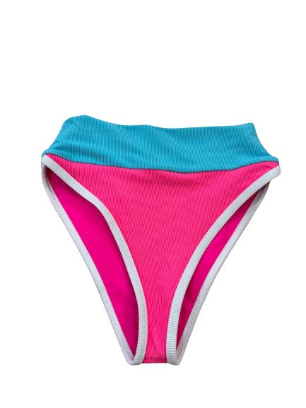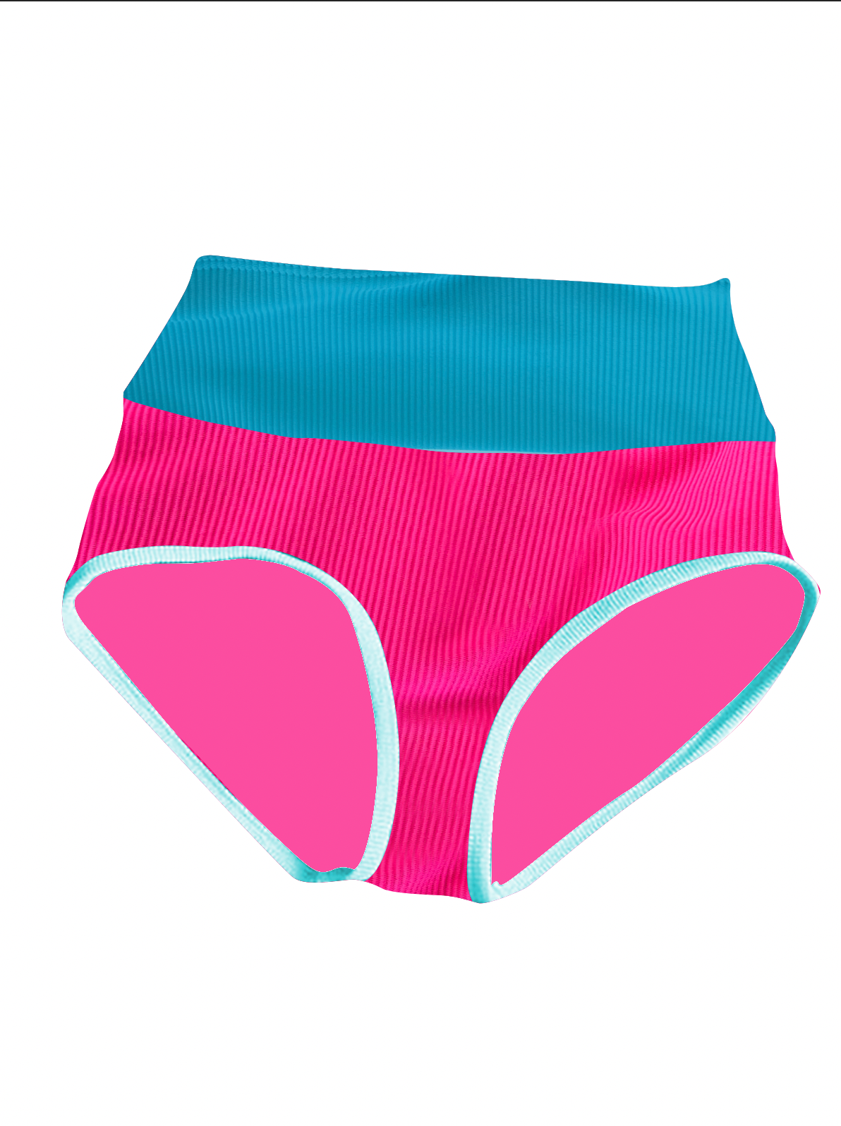 Ribbed high waisted bottoms, run TTS. Shade is Sea and barbie pink.