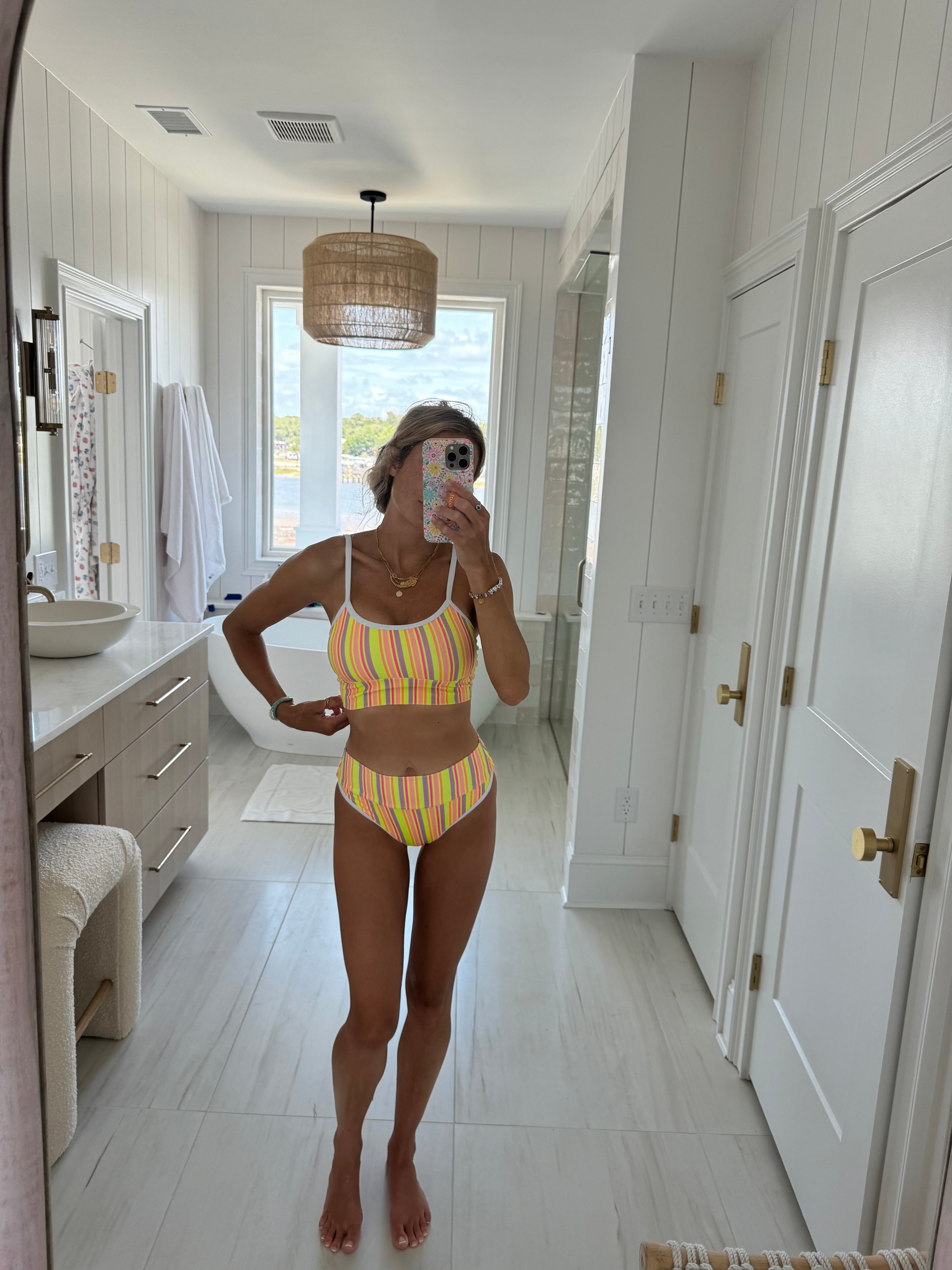 Ribbed skinny strap top with adjustable straps and removable padding.  Runs TTS, size up for better fit.   Model wearing size XS.