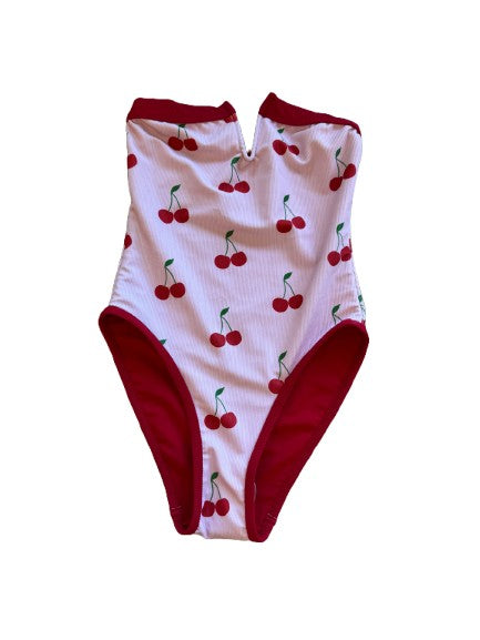 Comes with removable/adjustable straps, shelf bra and padding! Print is cherries with a blush pink background and red trim. Mix and match with red styles.