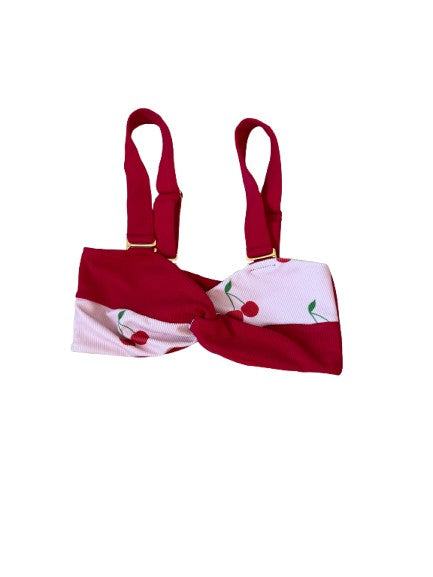 Twist top with removable, adjustable straps! Print is cherries with a blush pink background and red trim. Mix and match with red styles, no padding
