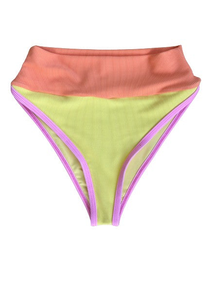 High waisted ribbed bottom, runs true to size. Lemon shade with cantaloupe band and pitaya trim. Model wearing size XS.PREORDERS TAKE 10-12 WEEKS, REVIEW RETURN POLICY. EMAILS WITH TRACKING WILL BE SENT ONCE SHIPPED!