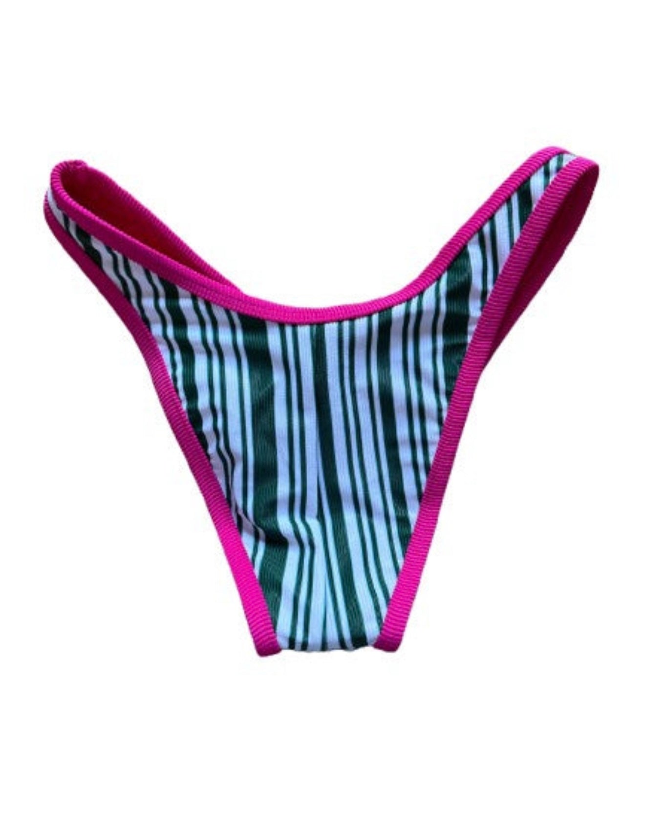 New collab print, dark green with dragonfruit trim. Mix and match dragonfruit shades. Runs TTS. Newest style, low rise and cheeky. The back is the first photo