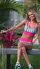 New collab print, dark green with dragonfruit trim. Mix and match dragonfruit shades. Shelf bra and removable padding. Runs TTS.