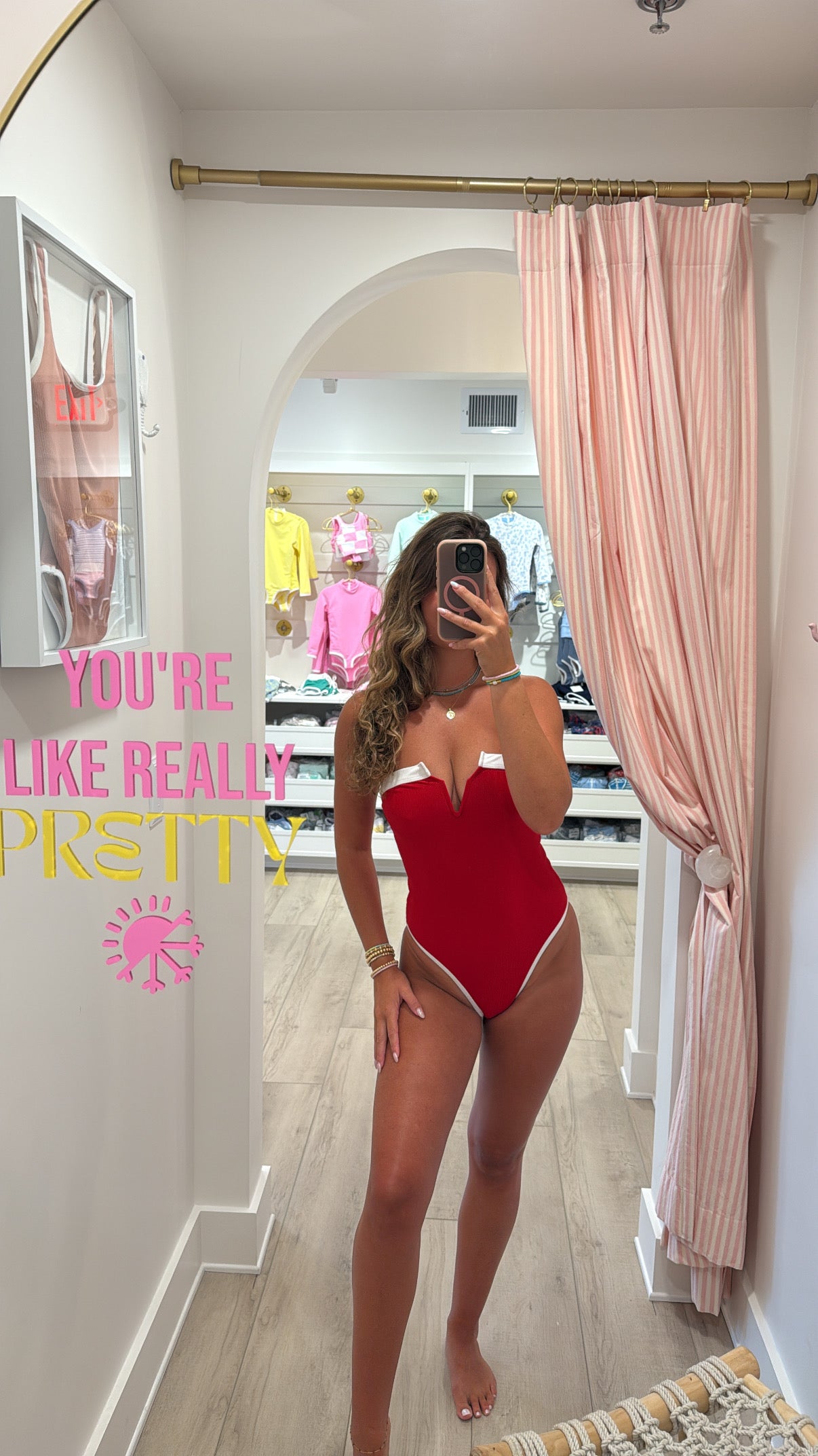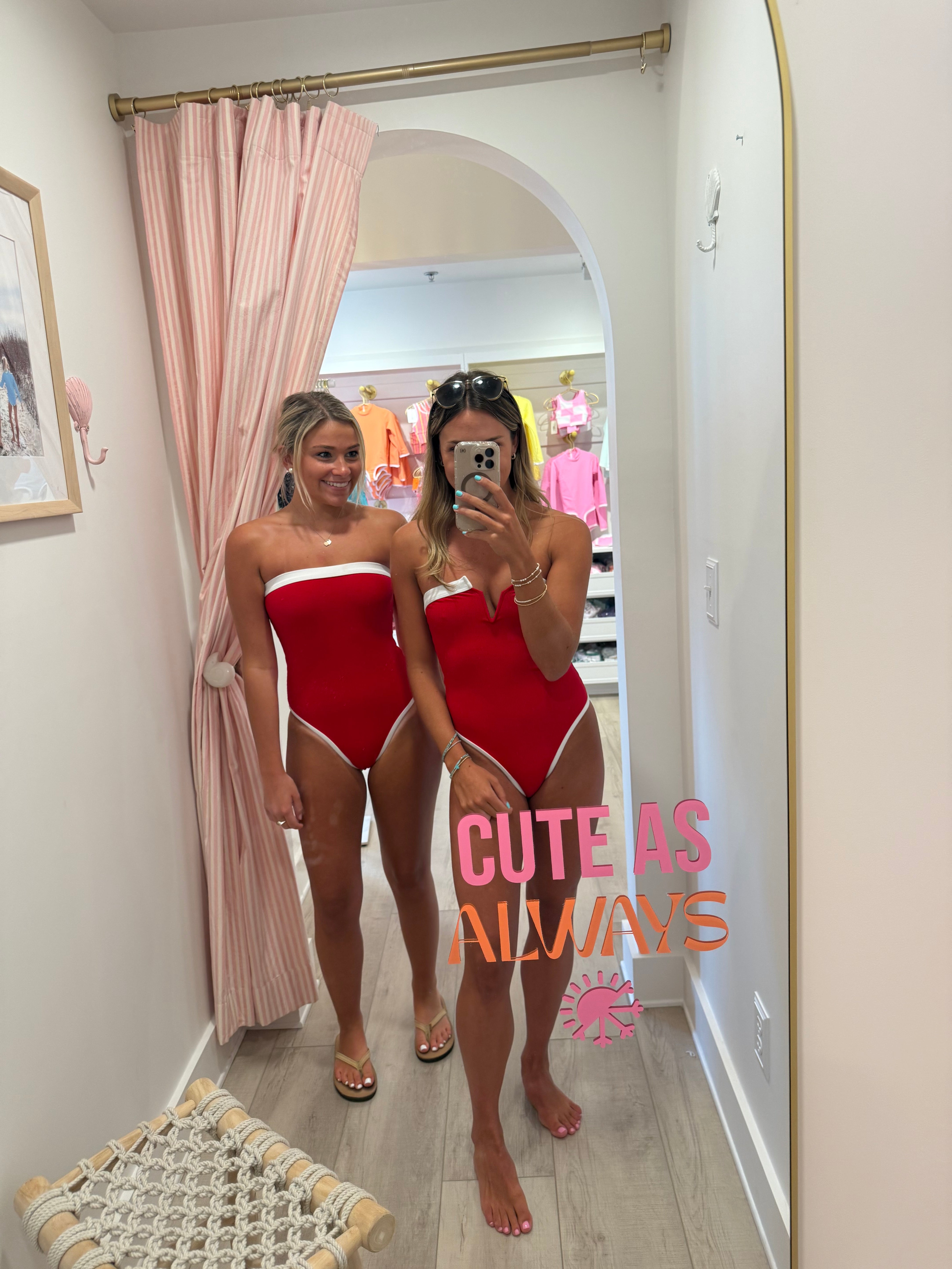 SELECT STYLE BEFORE ADDING TO CART! Classic or V CUT. New style, strapless one piece with removable straps, shelf bra and padding! Red solid with white trim. Mix and match with red styles.