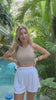 Ribbed, white trim, runs TTS. Model wearing size XS.Sports bra feel, made in the USA