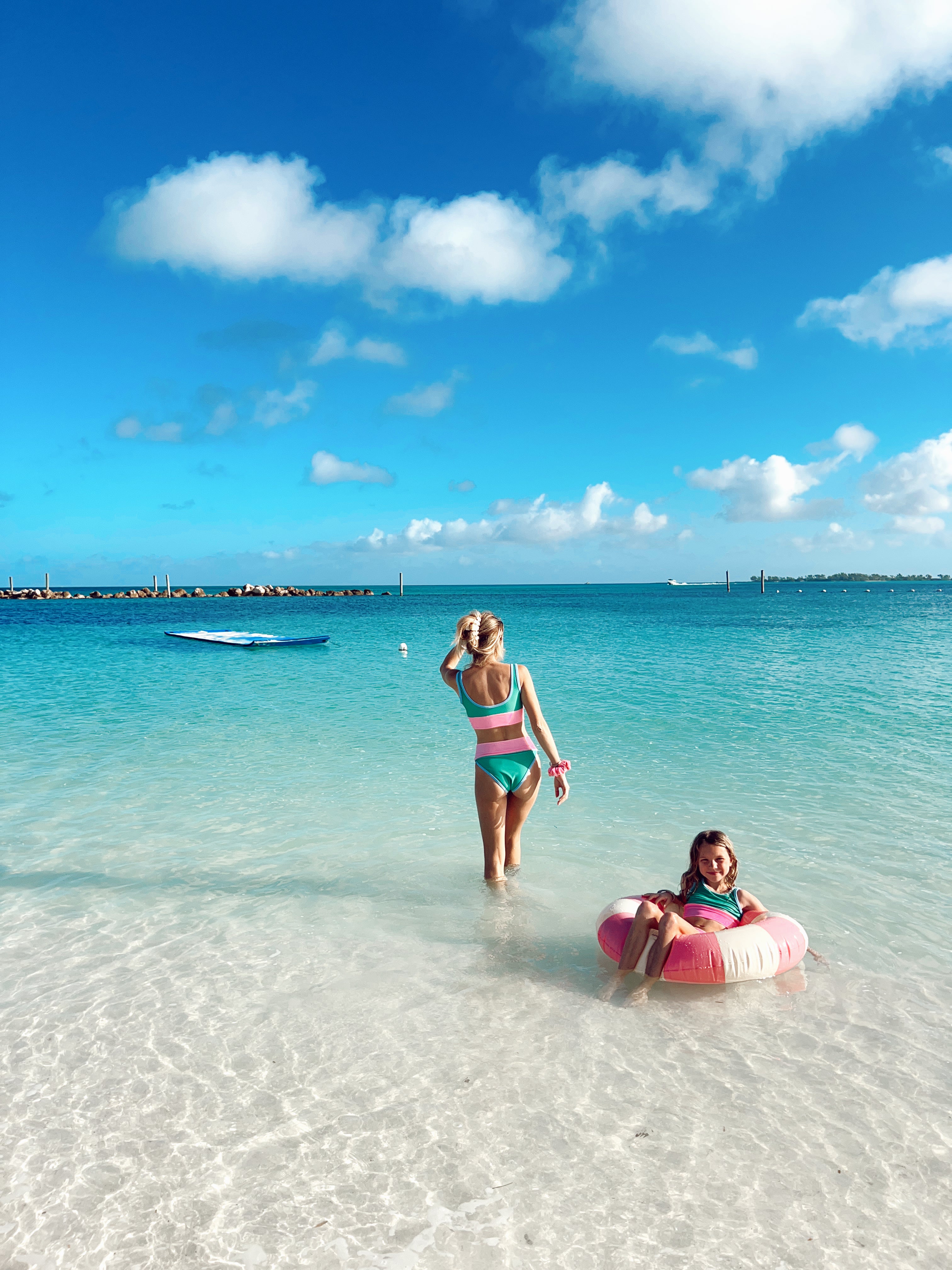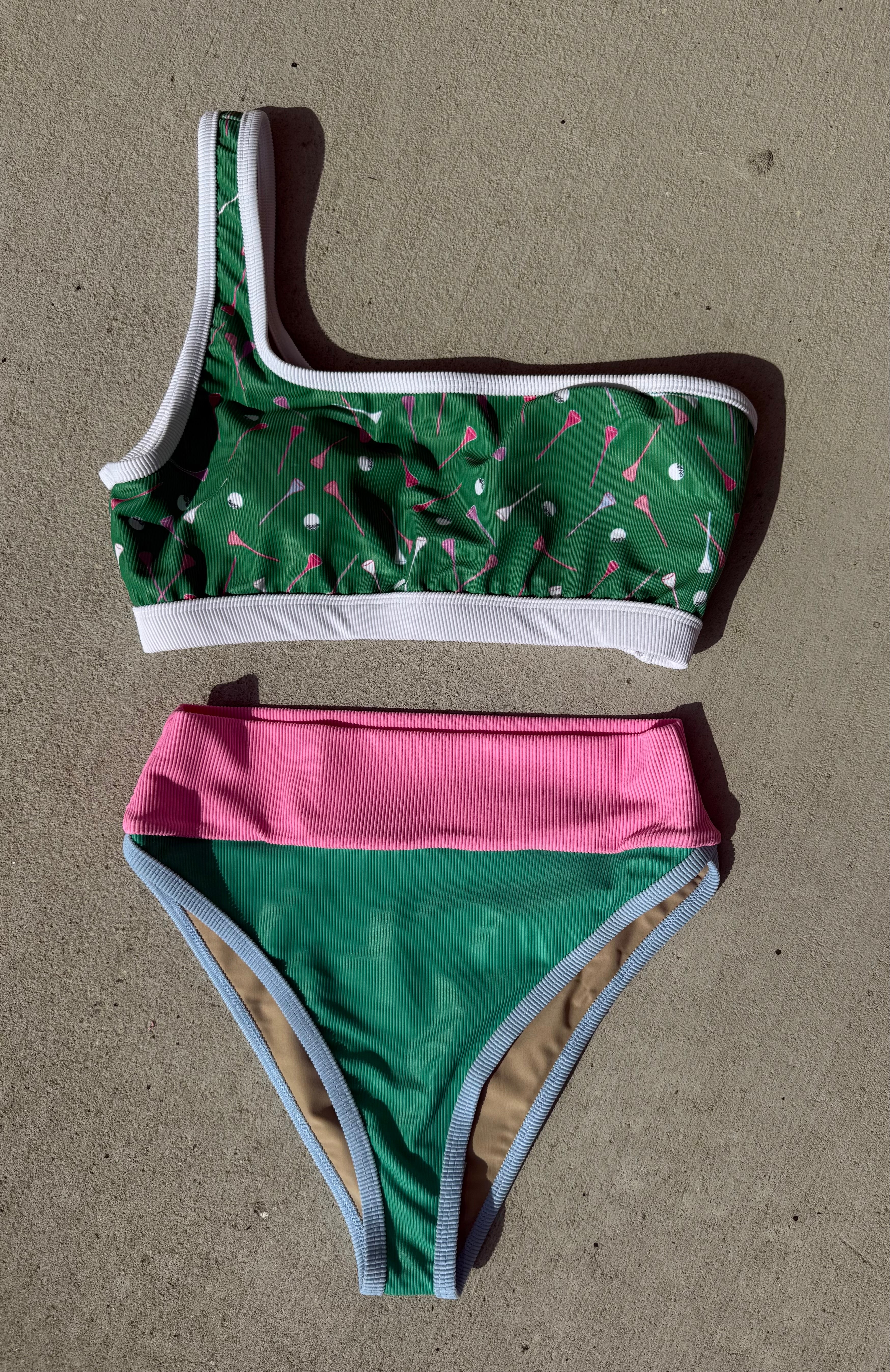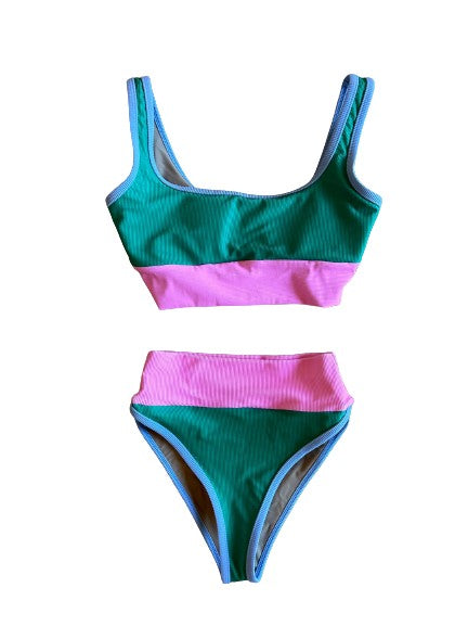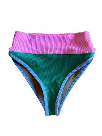 Highwaisted ribbed bottom with emerald shade, pitaya band, and carolina blue trim. Runs TTS. Model wearing size XS.Made in the USA. Avoid contact with rough surfaces.