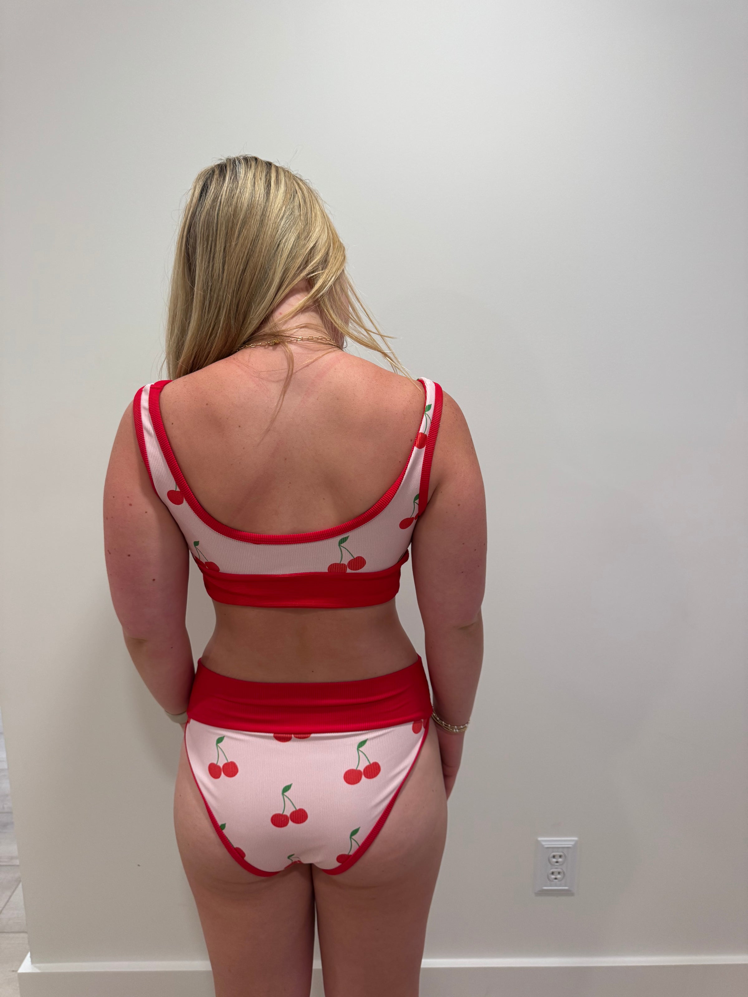 Our Signature ribbed printed top, with red band. Print is cherries with a blush pink background and red trim. Mix and match with red styles. Shelf bra, and removable padding.