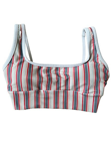 Ribbed bikini top, shelf bra/removable padding. Runs TTS. Mix and match with Red or Denim OTEX CERTIFIED MATERIAL, MADE IN THE USA.