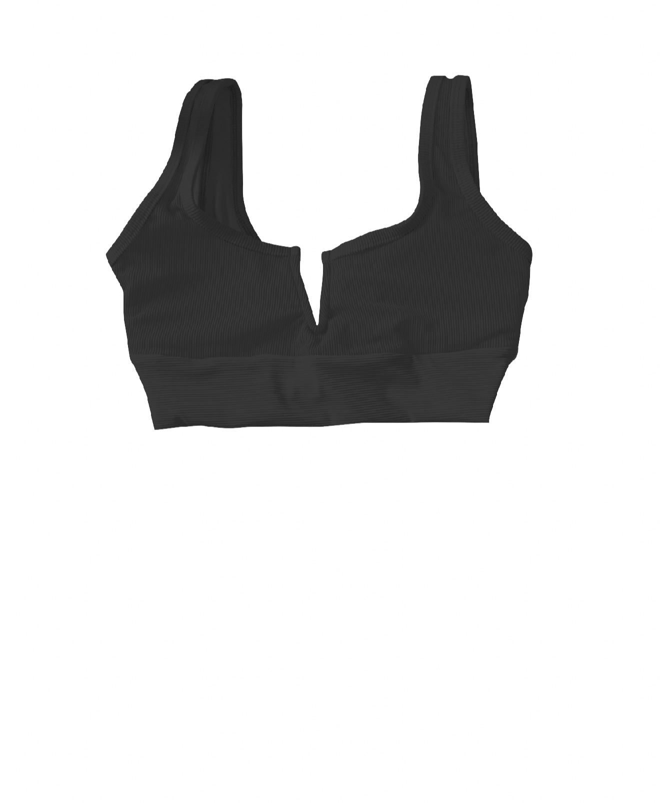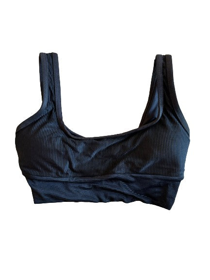 Traditional black on black ribbed bikini. Shelf bra and removable padding. Runs TTS. Model wearing size XS.Made in the USA, OTEX- CERTIFIED