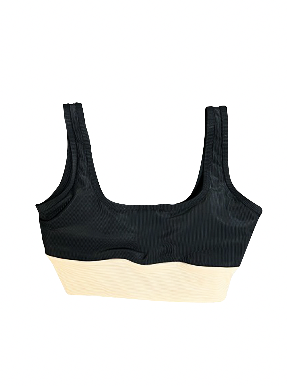 Kiawah ribbed top in Black/Sand combo, removable padding and shelf bra. Runs TTS. Model wearing size XS. Black trim.
