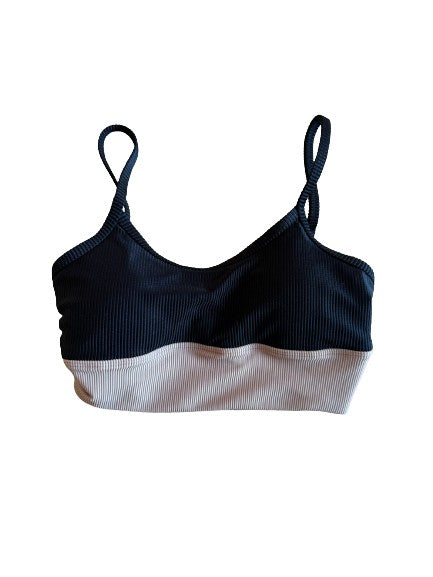 Black and sand band ribbed top, with adjustable straps. Shelf bra and removable padding. Black trim. Made in the USA, OTEX-certified